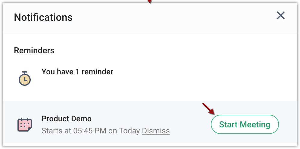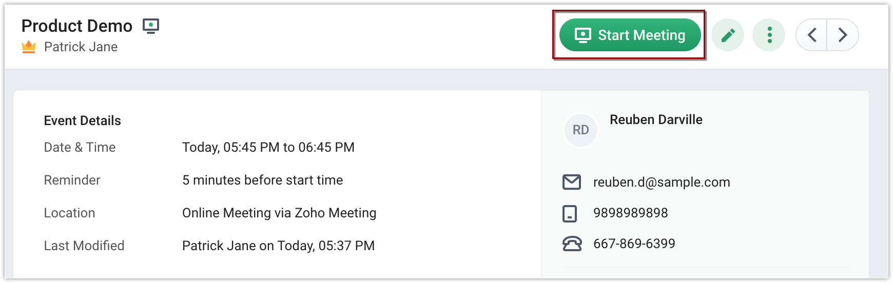 The online meetings can be started right from Bigin. The Start Meeting button will be available in the event details page, 15 minutes before the Event Start Time.