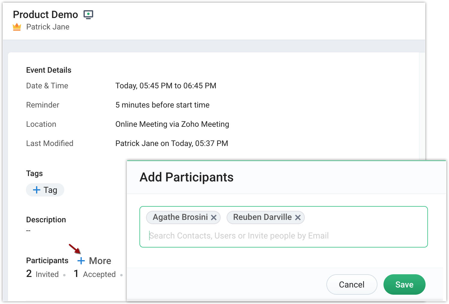 - Click +More in the Participants section and select contacts, users, or enter an email address.