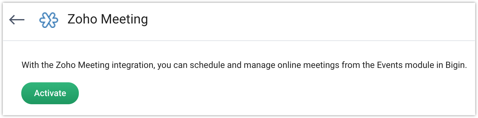 Zoho Meeting is an online meeting software, where you can hold online meetings in real-time. Integrating Bigin and Zoho Meeting, lets you create an online meeting right from the Events module in Bigin.