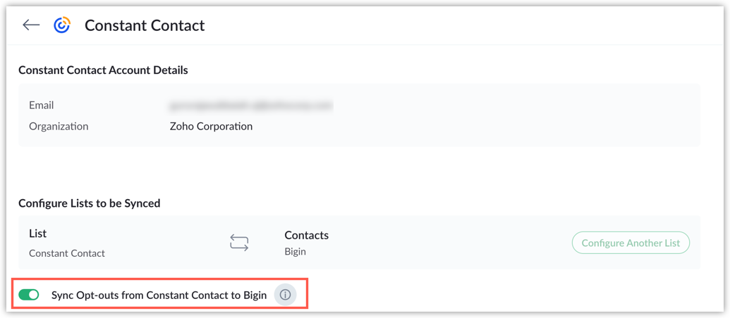 5. Enable Sync Opt-outs from Constant Contact to Bigin if you want to enable email opt automatically for a record in Bigin when the same contact unsubscribes from the Constant Contact mailing list.
