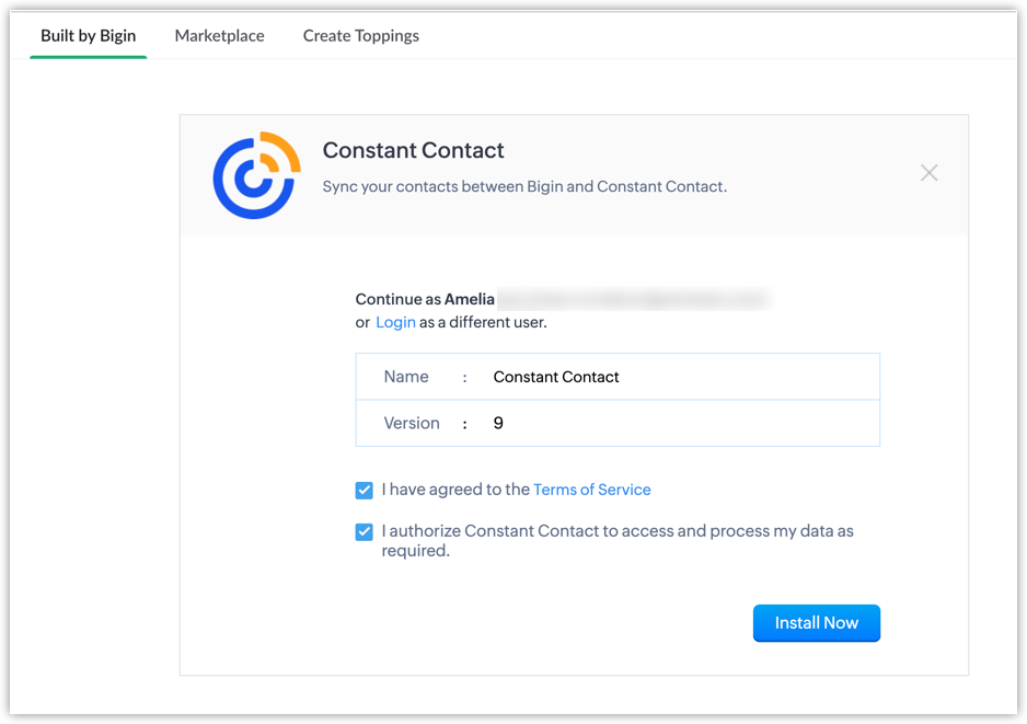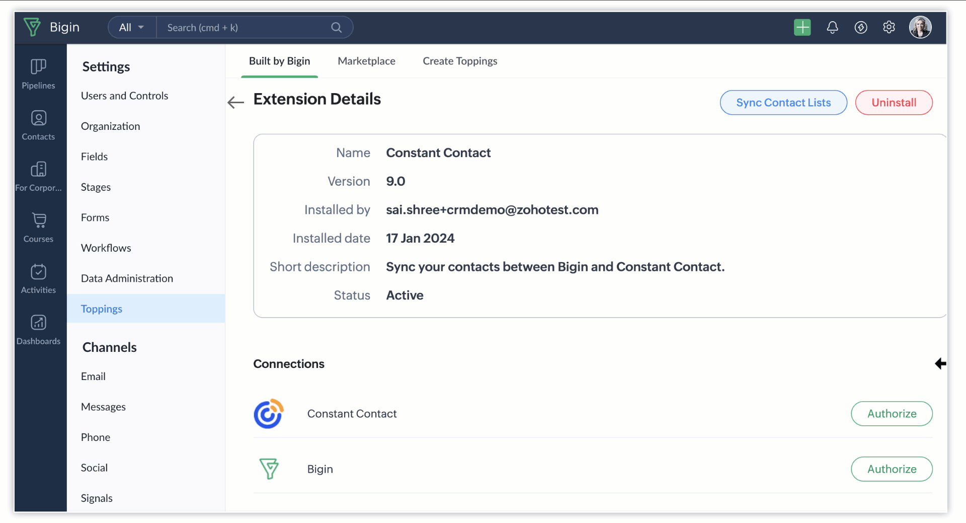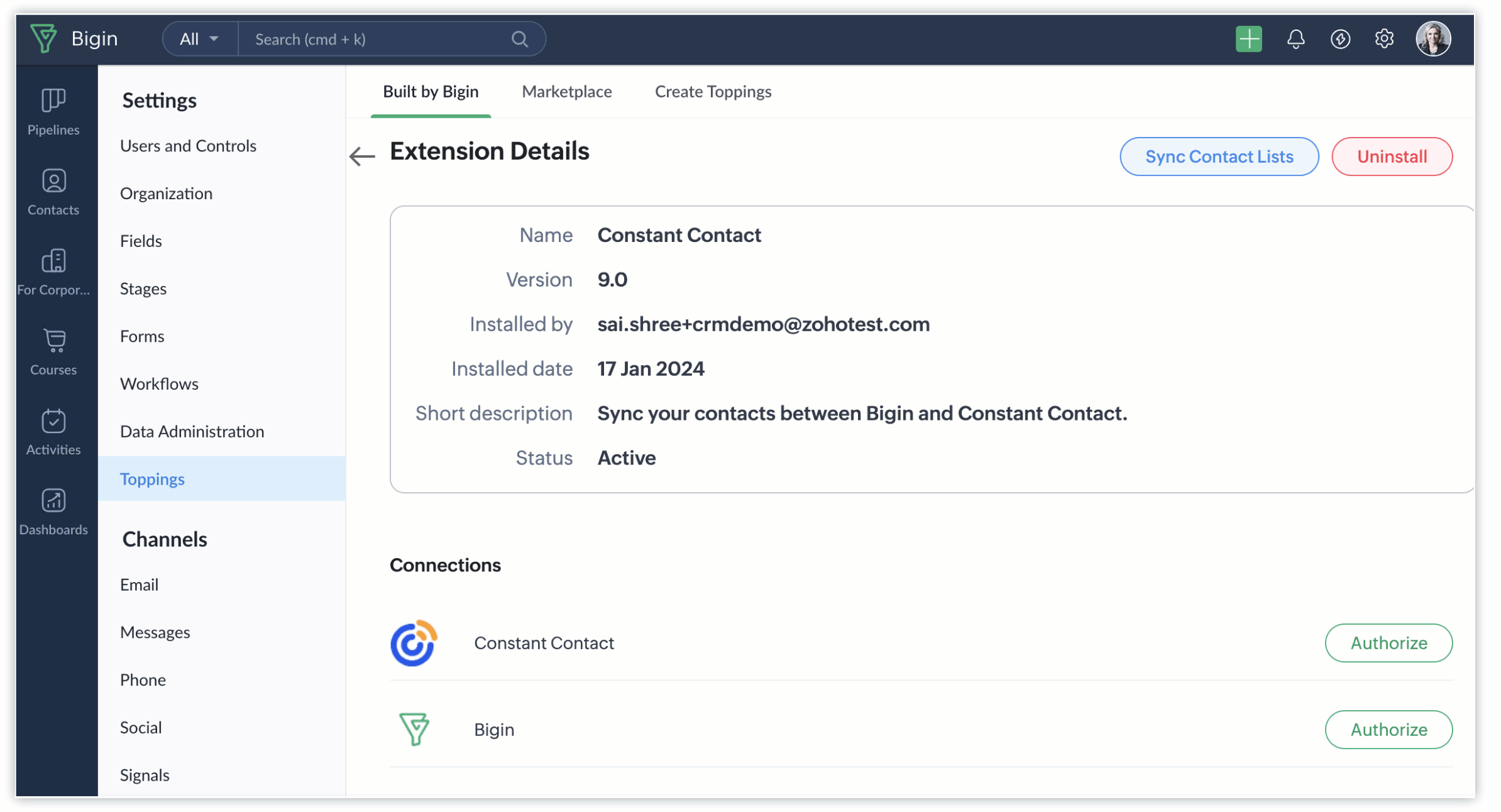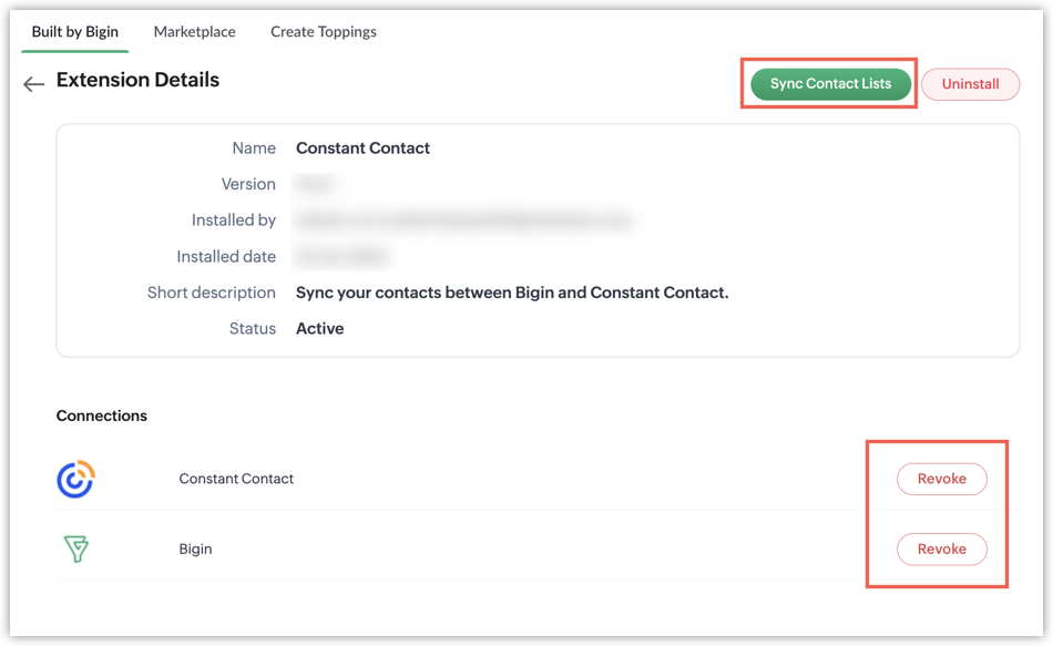 You can uninstall the Constant Contact topping from the Bigin account if it is no longer needed. If you uninstall this topping, the data sync between Bigin and Constant Contact will no longer work. However, uninstalling this topping will not delete any previously synced data.