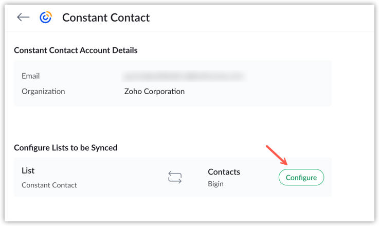 5. In the Configure Lists to be Synced section, click Configure to sync data from any list in your Constant Contact account with a list view in Bigin's Contacts module.