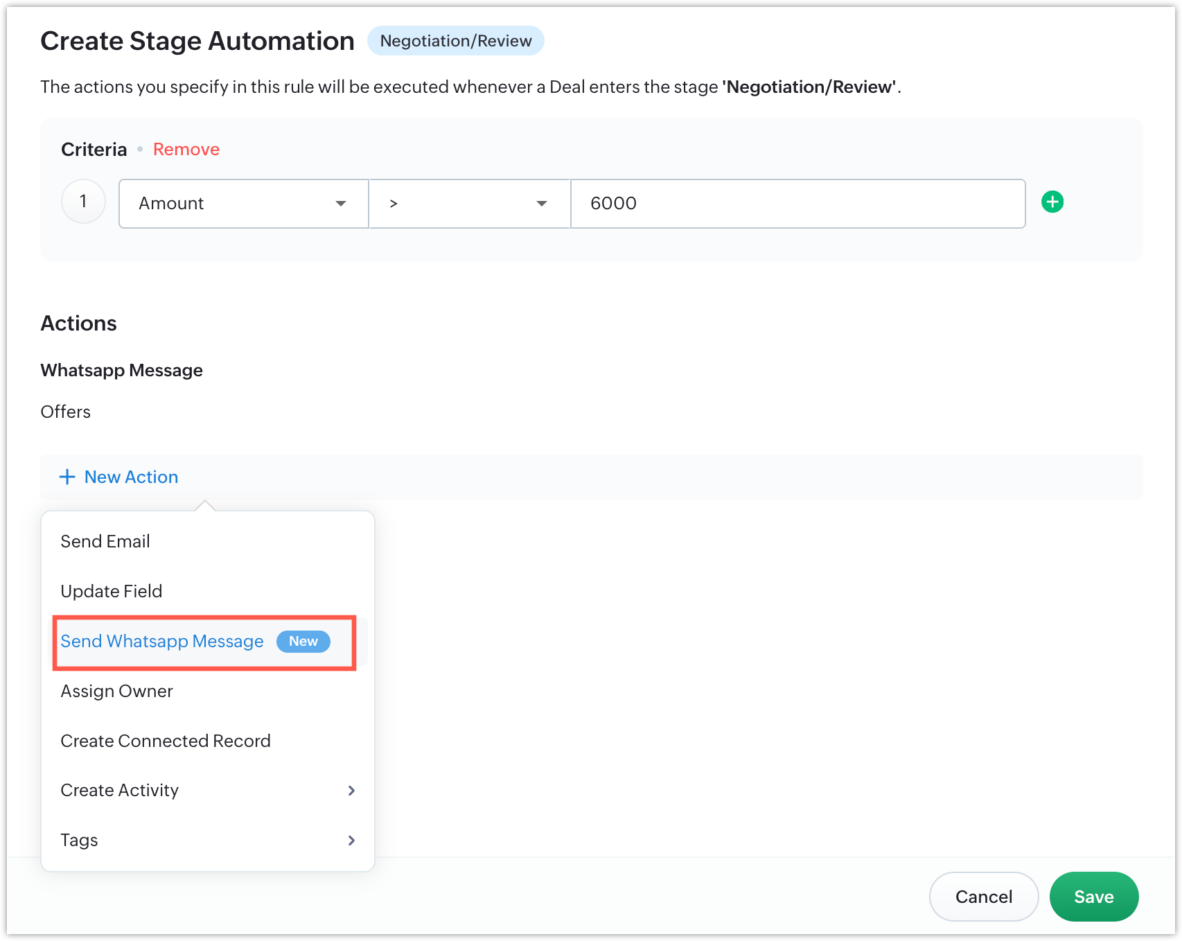 You can now add WhatsApp messages to Stage Automation. This means that whenever a record moves into a specific stage, the corresponding WhatsApp message will be sent automatically.