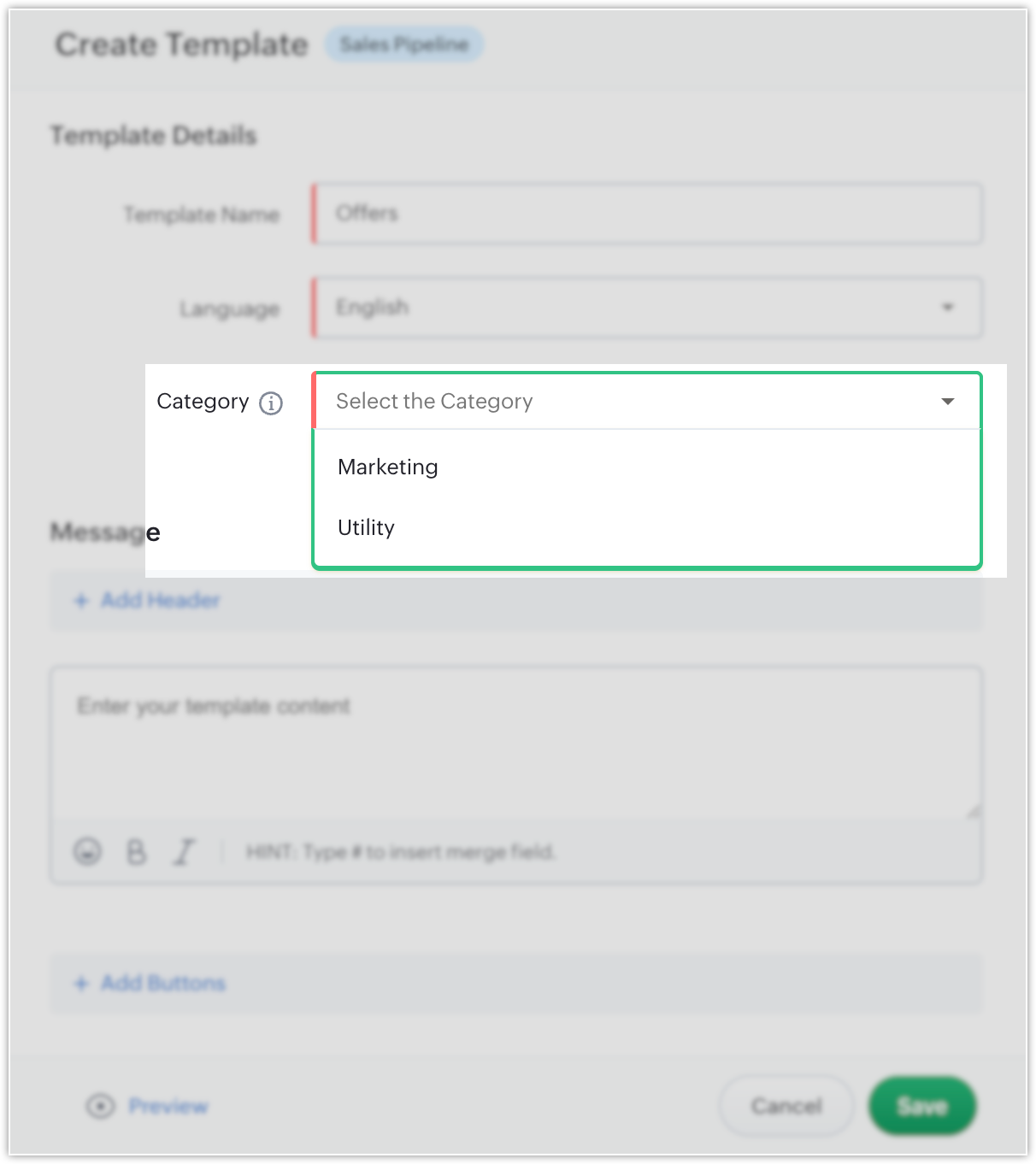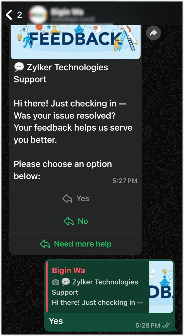 Reply Message: You can add up to three predefined messages for users to respond with. For example, Zylker Technologies can create a WhatsApp template to collect feedback on their support services. The support agent can send a message like “Was your issue resolved?” and include up to three quick-reply buttons, such as “Yes,” “No,” and “Need Help.” These buttons allow customers to respond instantly with a single tap.