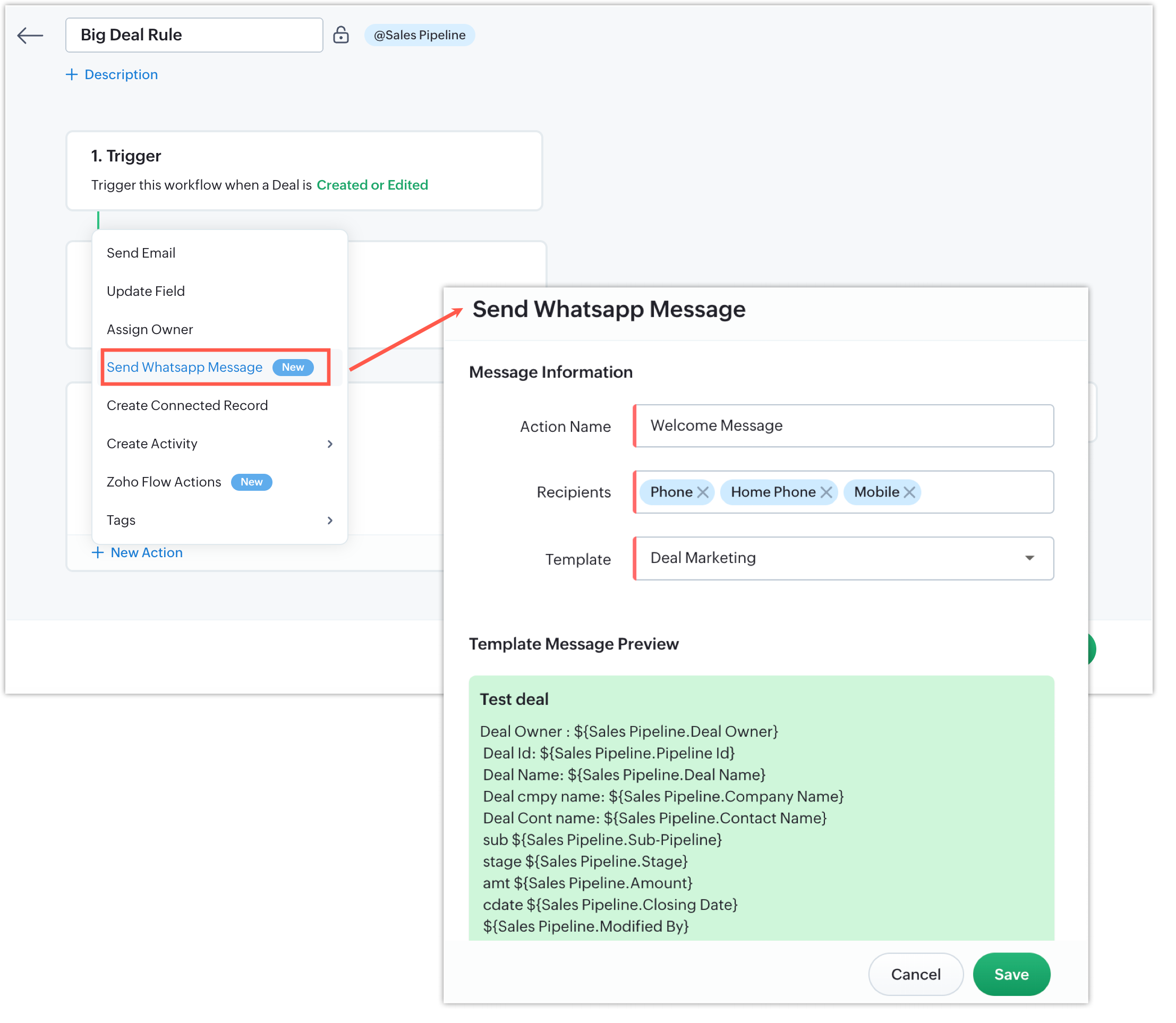 You can add WhatsApp templates as an action in your workflow rules. Once set up, whenever a workflow is triggered, such as when a new deal is added, a deal stage is updated, or a task is created, the corresponding WhatsApp message is sent automatically.