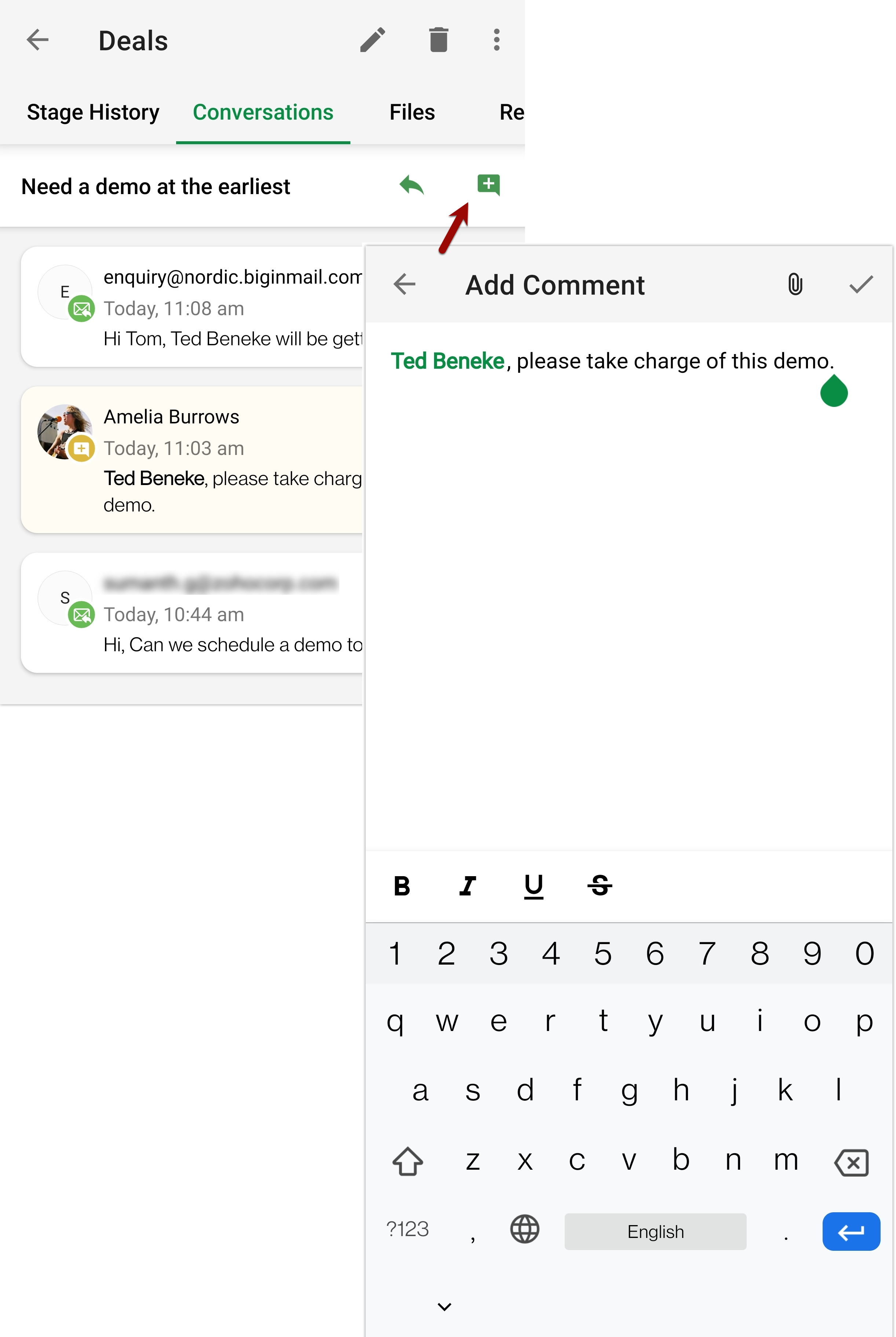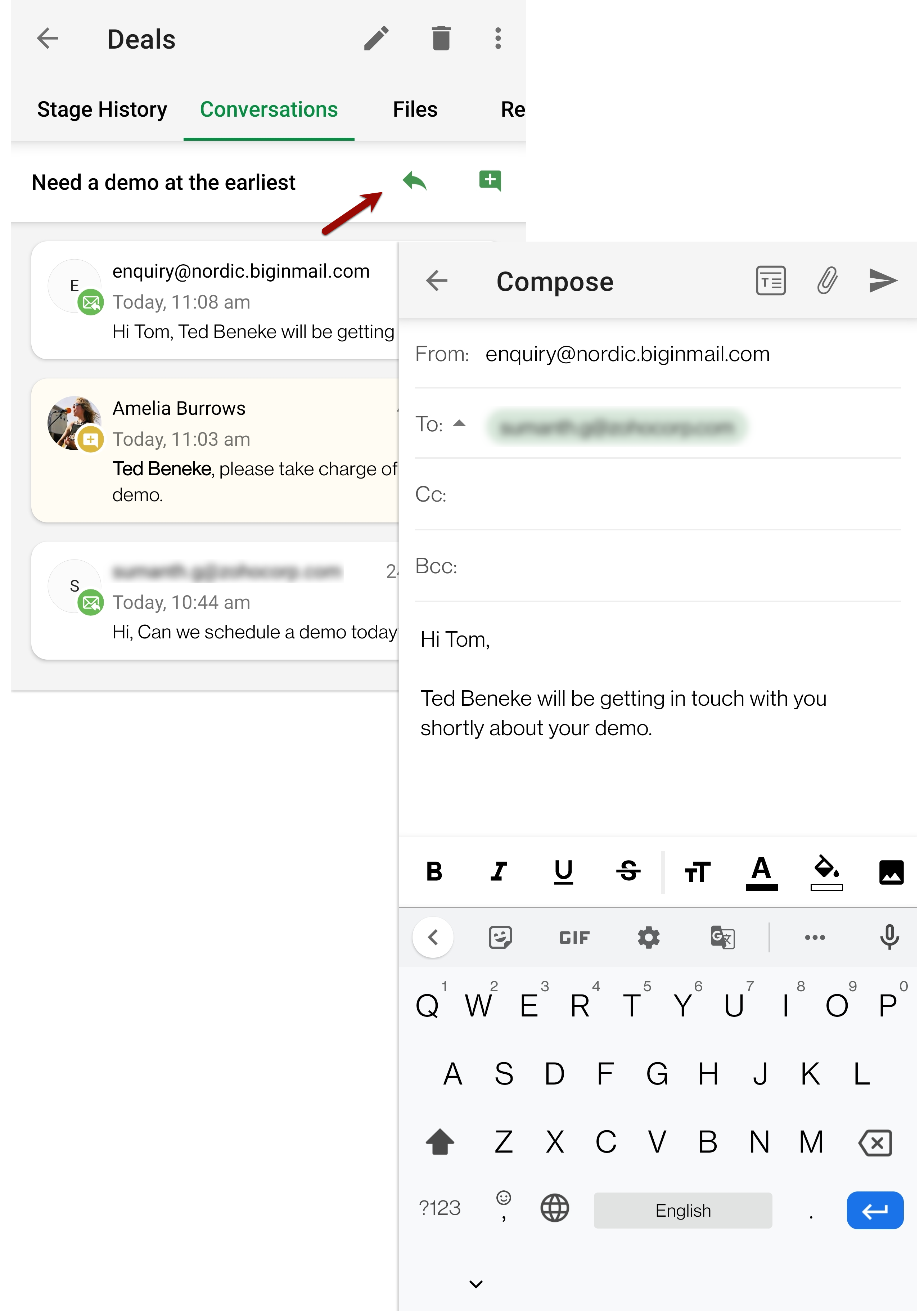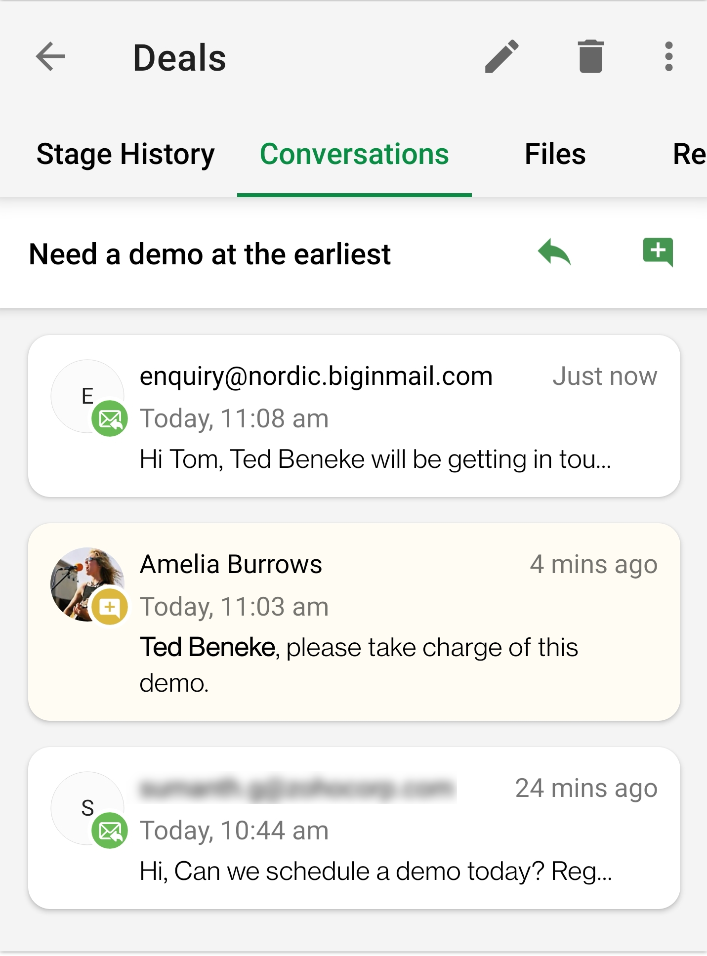 Email conversations made in the same email thread can be found under the Conversations tab in a chronological sequence. New emails outside the email thread will be converted as a new record in the pipeline.