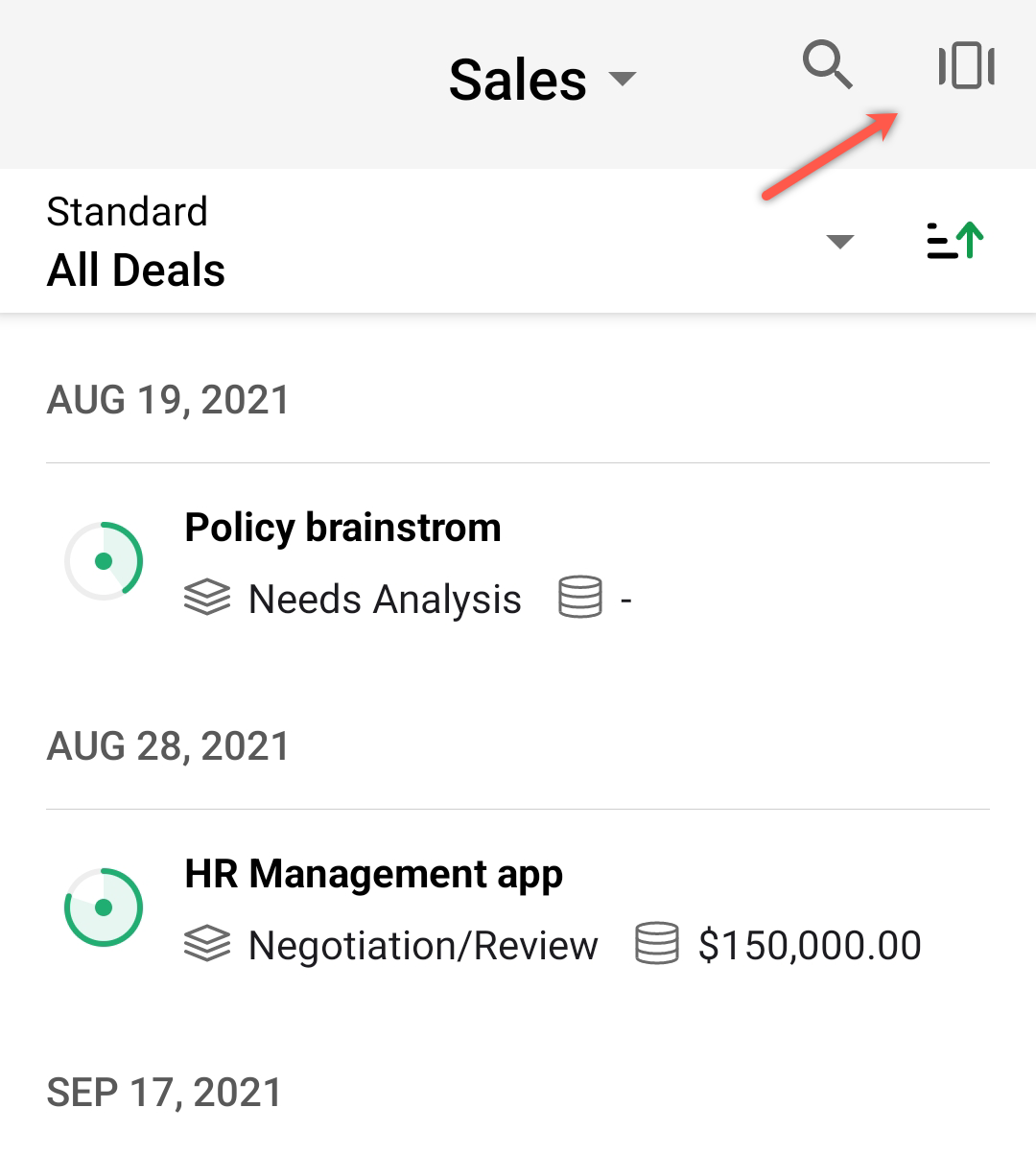 The pipeline view categorizes the records by deal stage. It is only available in the Pipelines module
