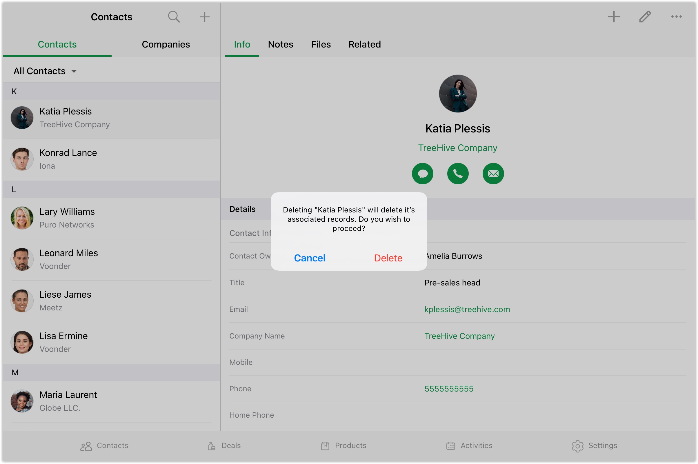 To delete a record 1. Open the Bigin app on your iPad. 2. Navigate to the Products module. 3. Select the desired product record. 4. Tap the More icon at the top right of the screen. 5. Select Delete. 6. Choose "Delete" in the confirmation prompt to ...