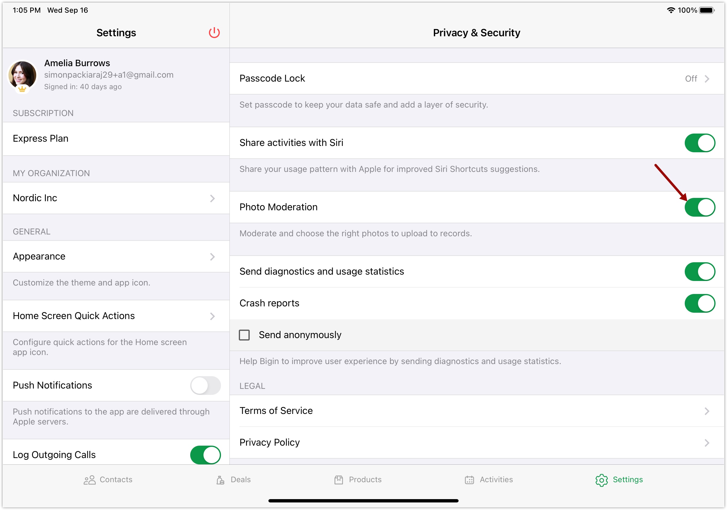 Photo moderation feature, on your Bigin Native app for iPhone, allows you to moderate and choose appropriate photos to upload to the records in Bigin. The feature operates strictly on the user’s device without any need for a network connection, thus keeping your data secure without compromising on privacy. As it operates on the user's device it also minimizes memory footprint and power consumption.