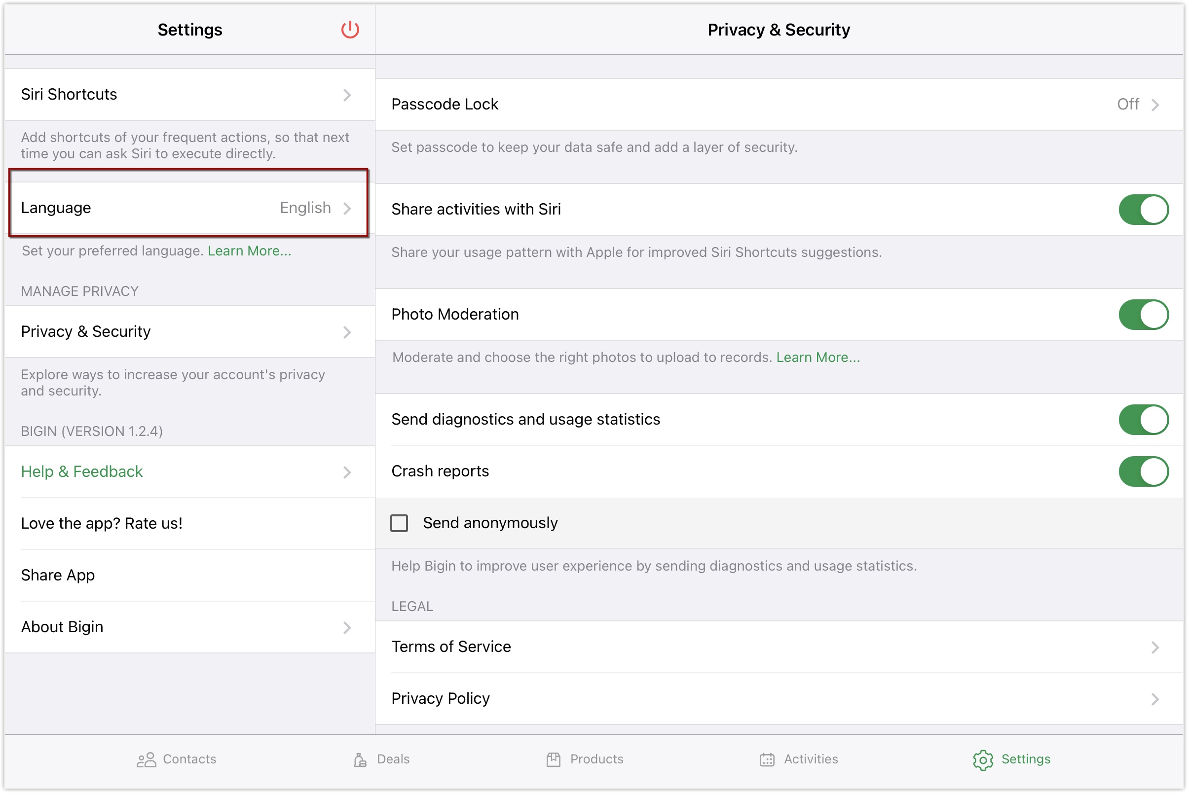 To set a passcode lock 1. Open the Bigin app on your iPad. 2. Tap on Settings at the bottom right of the screen. Under "Manage Privacy", you can find the title "Privacy & Security". 3. Tap on Privacy & Security > Passcode Lock. 4. Select "Turn ...