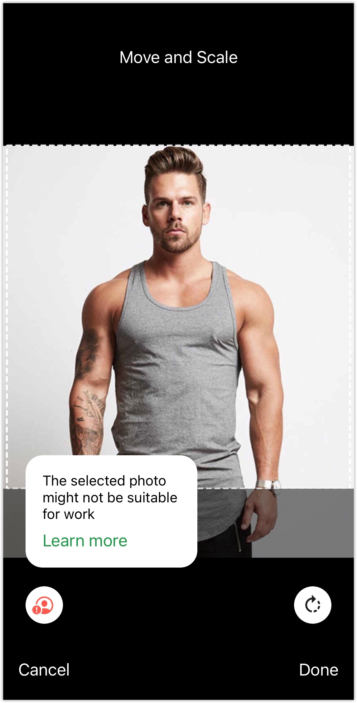 The feature sends a warning message when a user uploads images that are not suitable for work. For instance, images that depict hate, violence, nudity, drugs, gore, offensive gestures and signs, etc.
