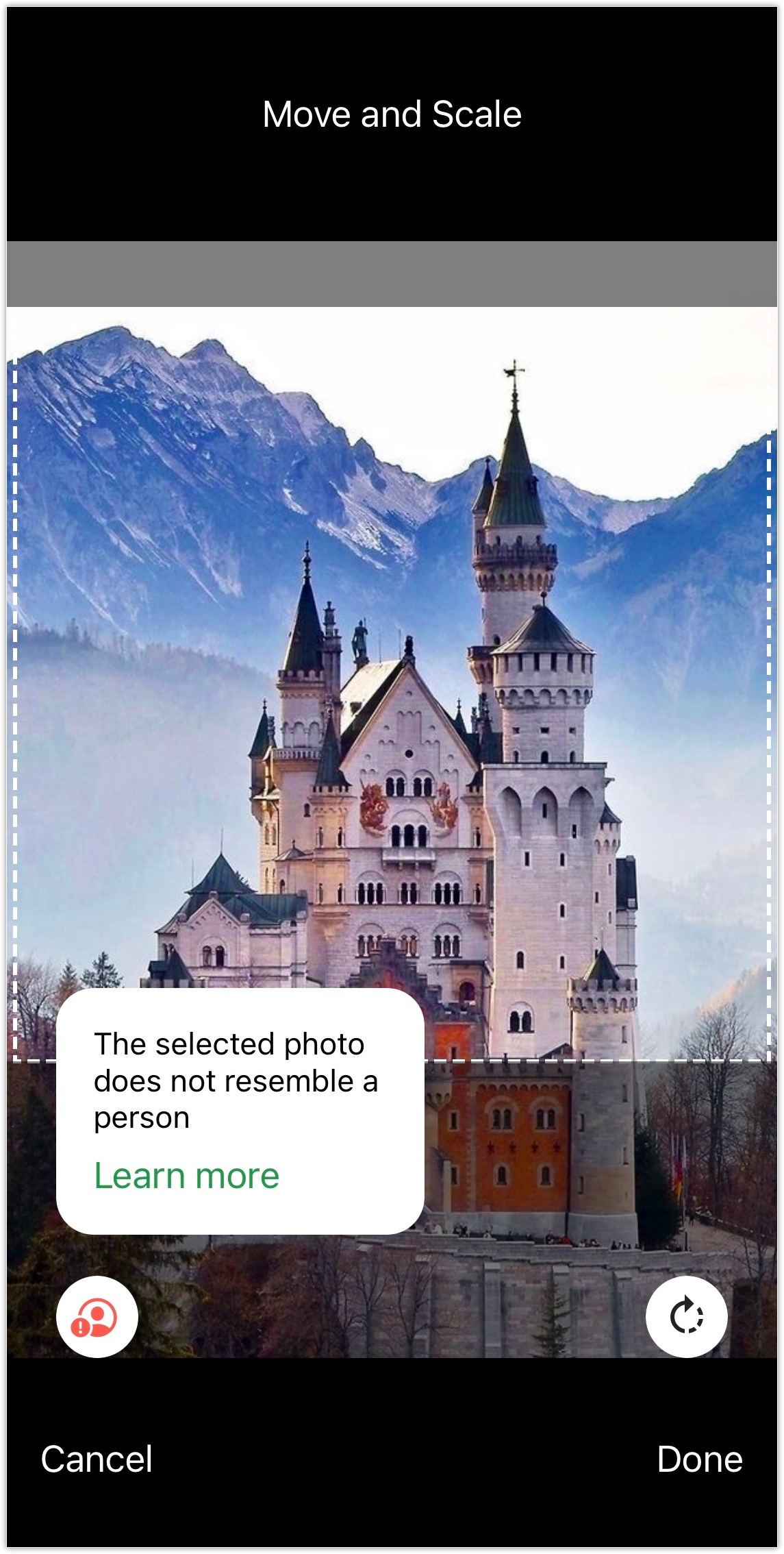 The feature also sends a warning message to the user when the image uploaded deos not resemble a human.. Example: When an image of a building is uploaded as the Contact image, the user will see a warning message that the image doesn't resemble a person.