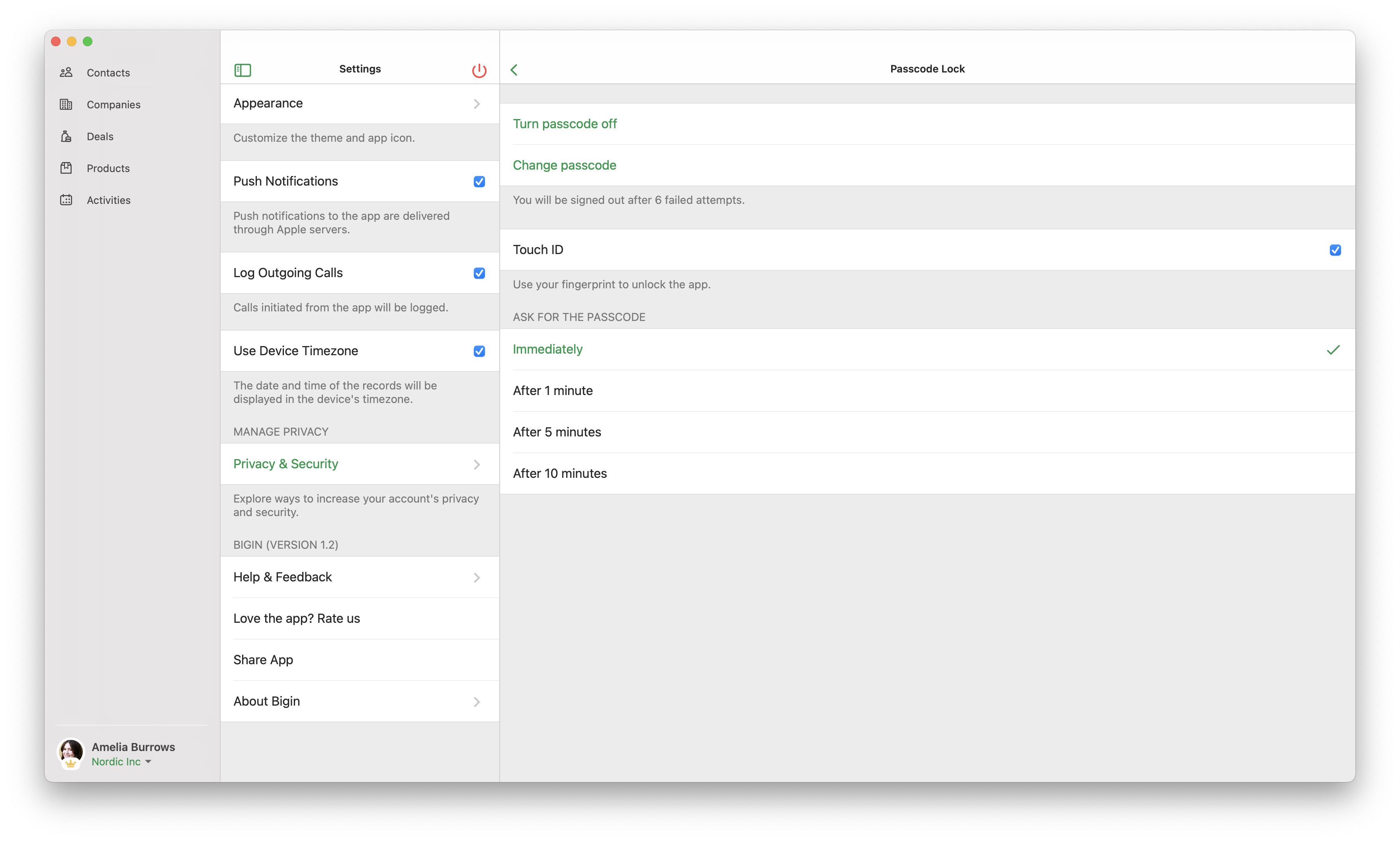 Access to Zoho CRM application can be prevented by enabling the Passcode lock. The user will be prompted to enter a four digit pass code to open the application.