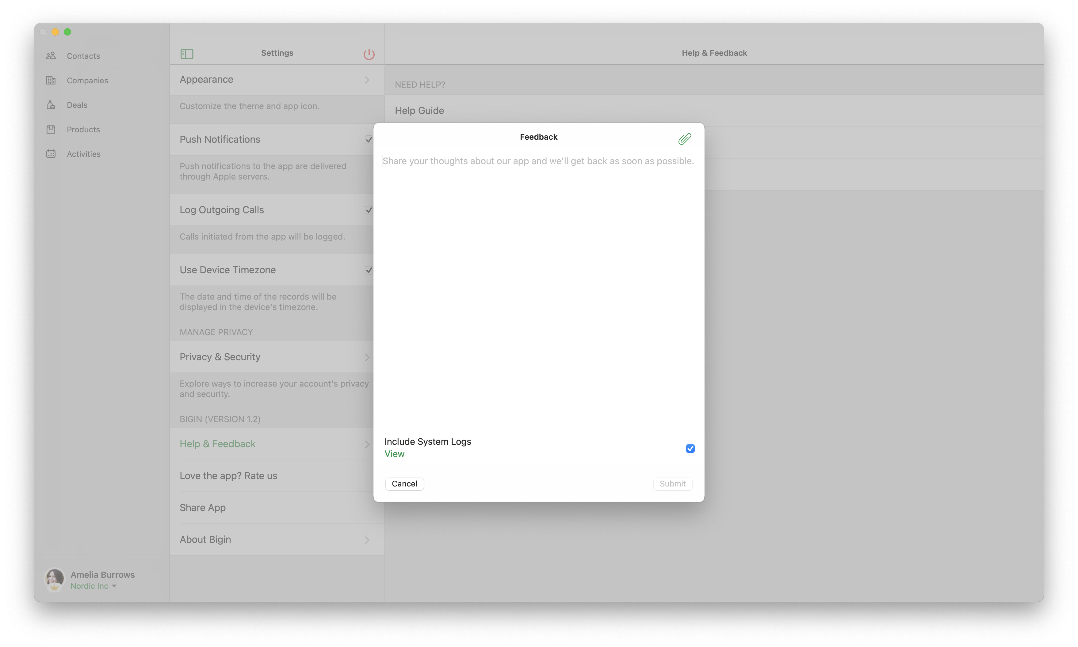 By enabling this option you can send diagnostic information to Bigin, which will help the team to understand the performance of the app. This information also helps in determining the root cause of a reported issue. You can send information through email, using your email address or you can also choose to send information anonymously.