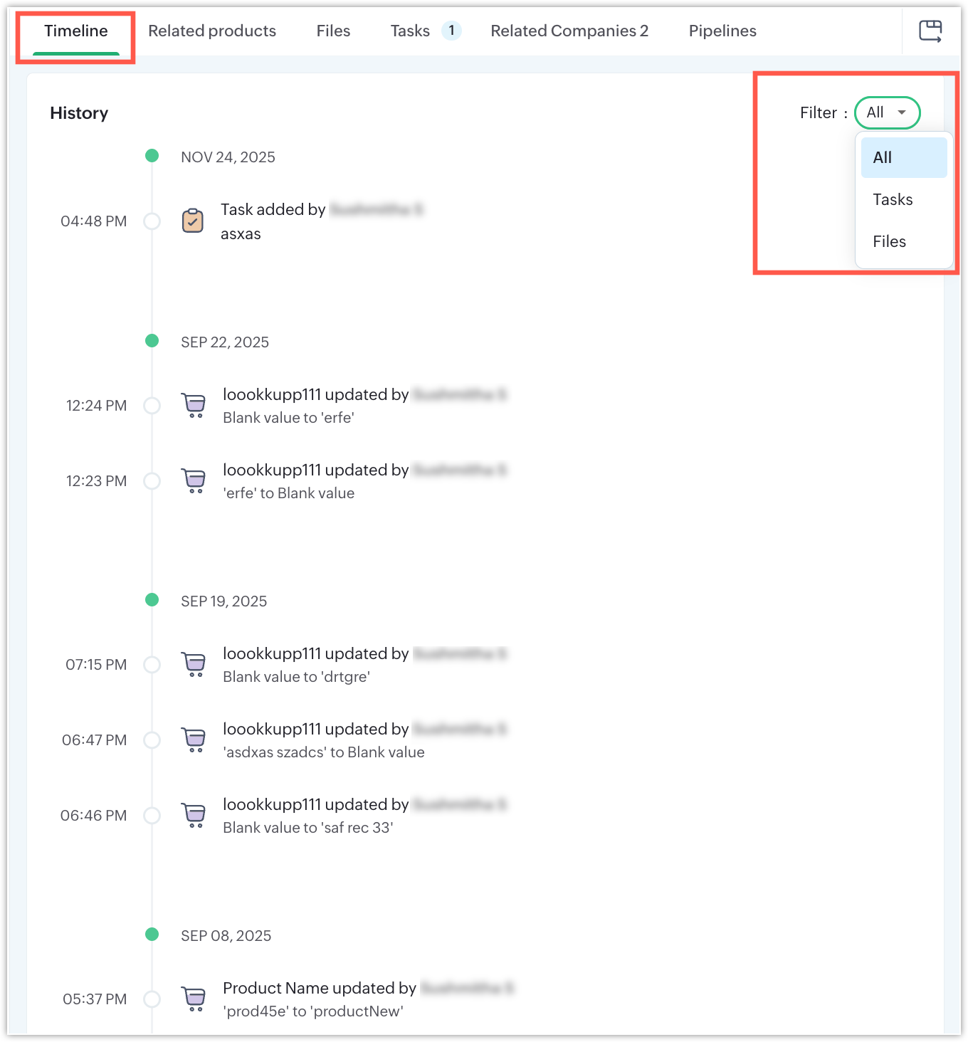 The record details page also displays the history of everything that is done to a record in the Pipelines Module under the Timeline tab.
