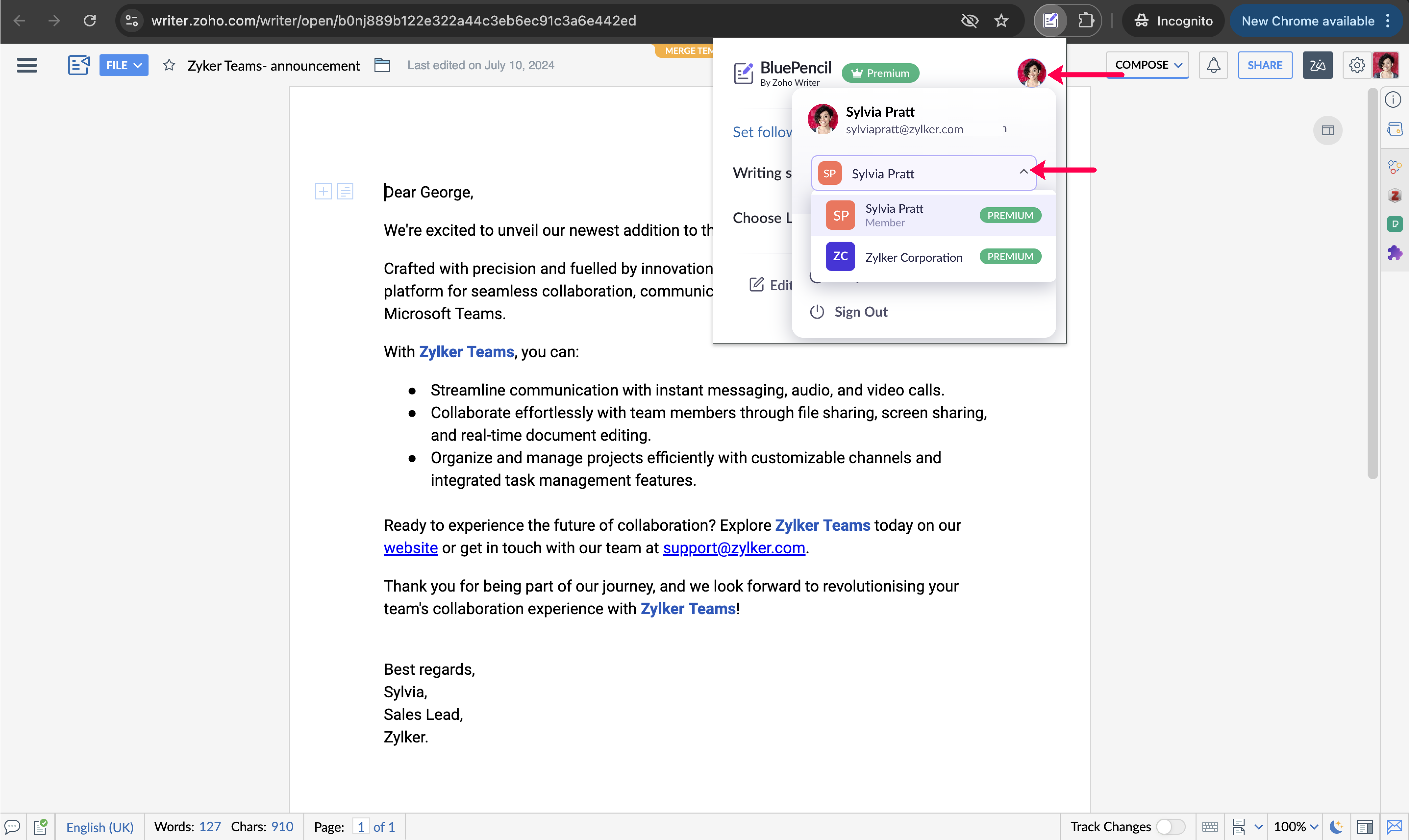 Overview of BluePencil Zoho BluePencil is a free grammar and spell checker that helps you write clear, concise, and error-free documents. It's available as a browser extension for Chrome and Firefox, ensuring accessibility wherever you write. After ...