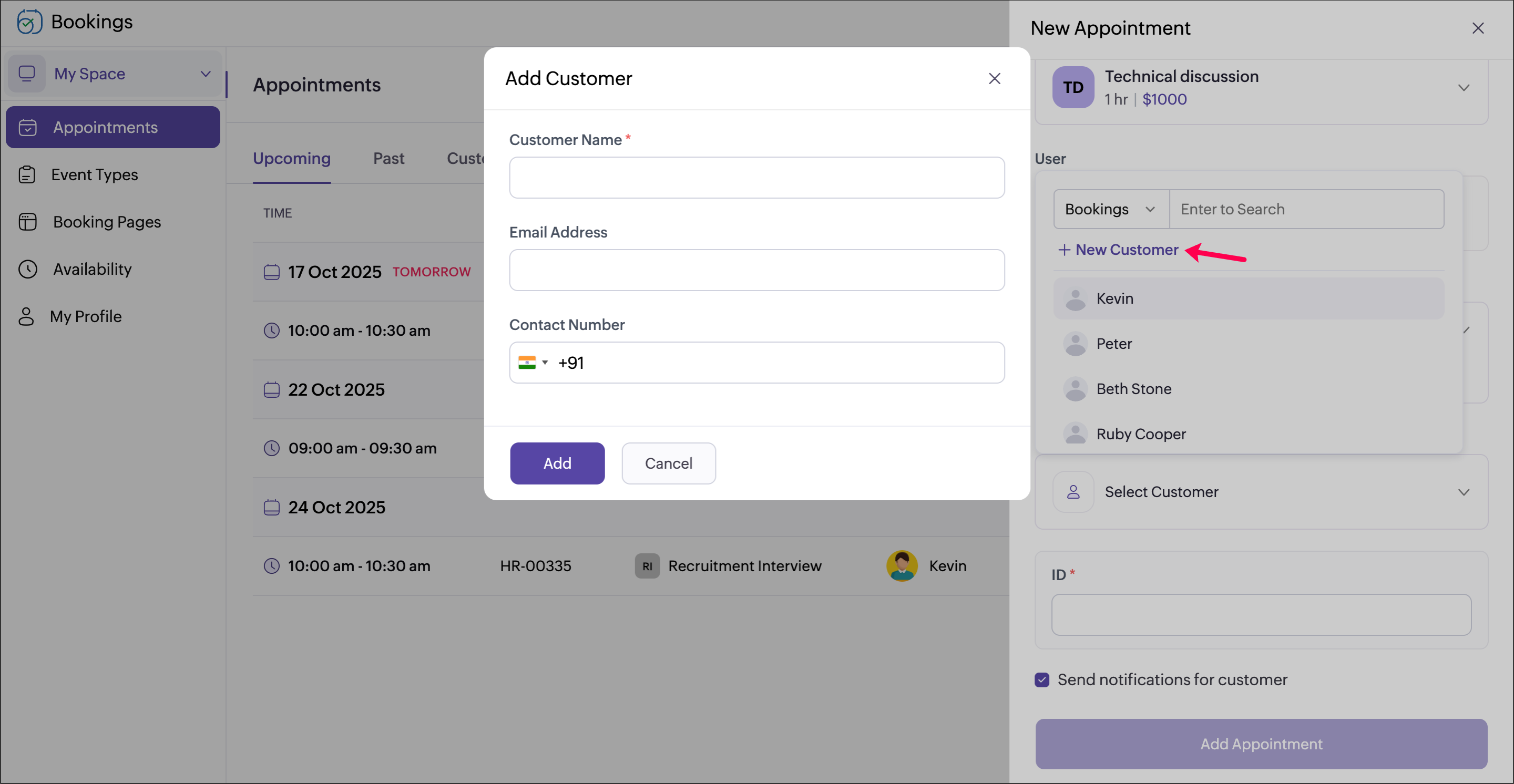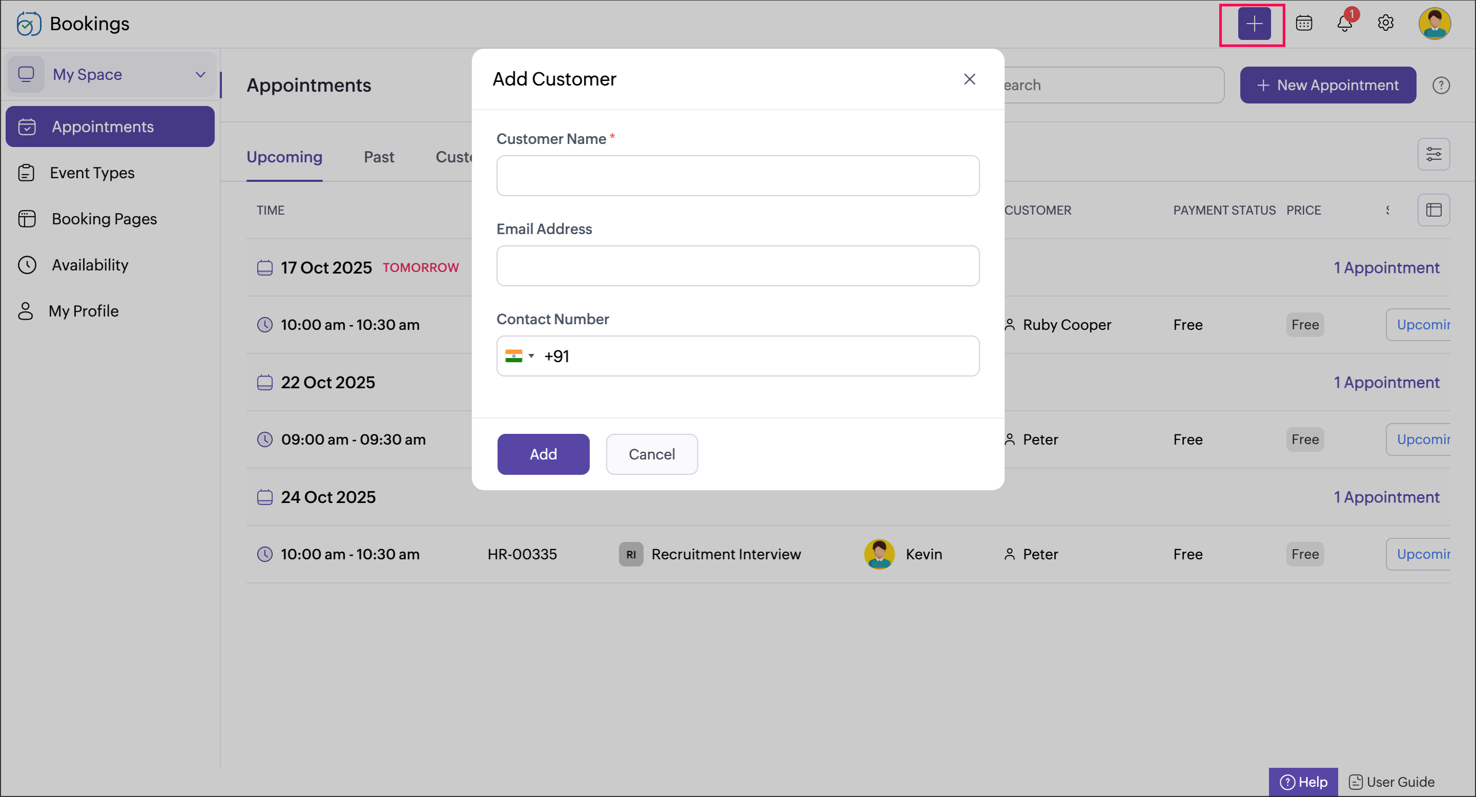 - Click Add. This adds the new customer. You can later book an appointment with the added customer.