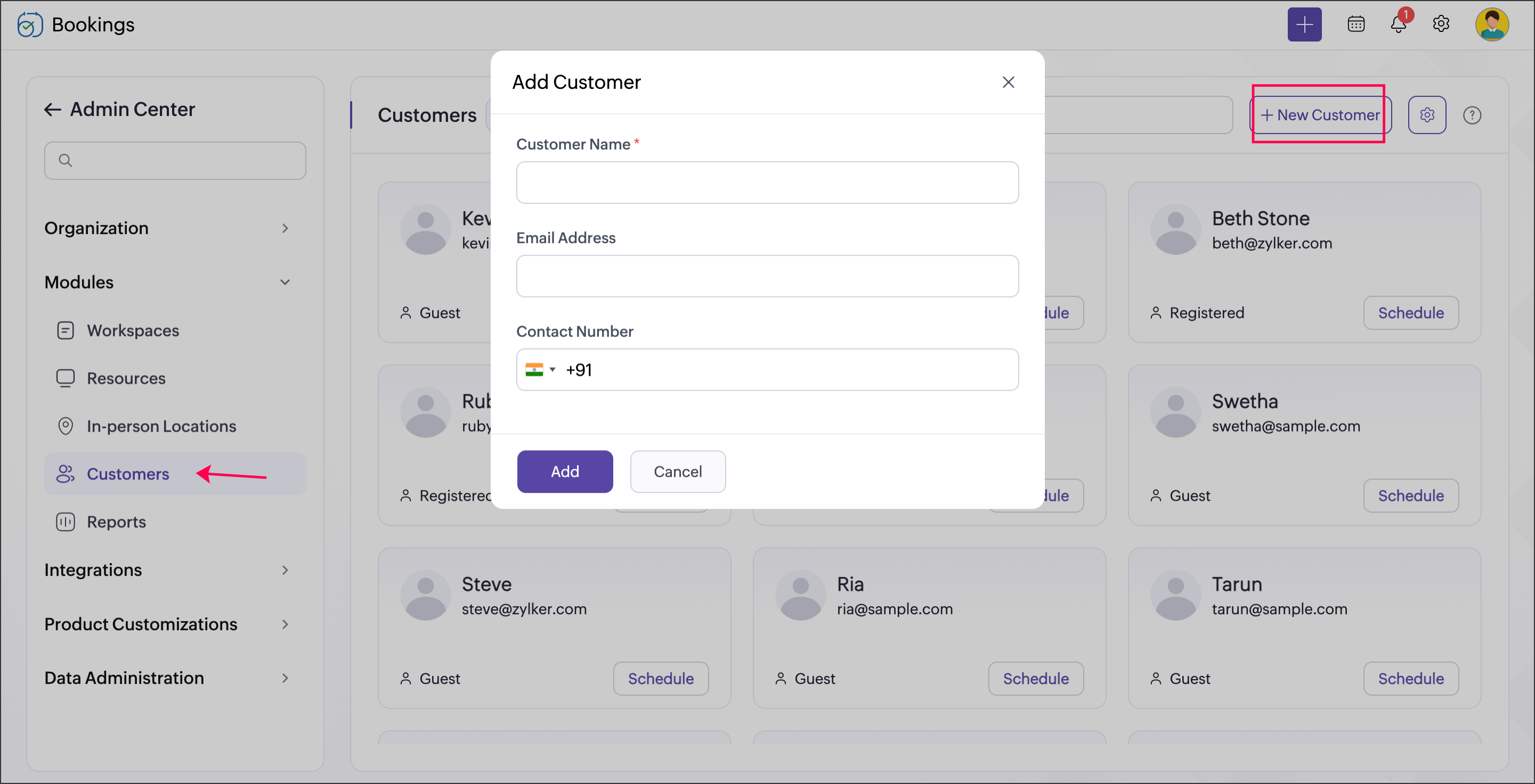 Customers can either be added by users directly from the app, or automatically when they book through your booking page. Once they schedule with you, they will be added as Customers in your Bookings organization. Their details and appointment history can be viewed under the Customers module. Additionally, Zoho CRM can be synced to Zoho Bookings by integrating with the respective product.
