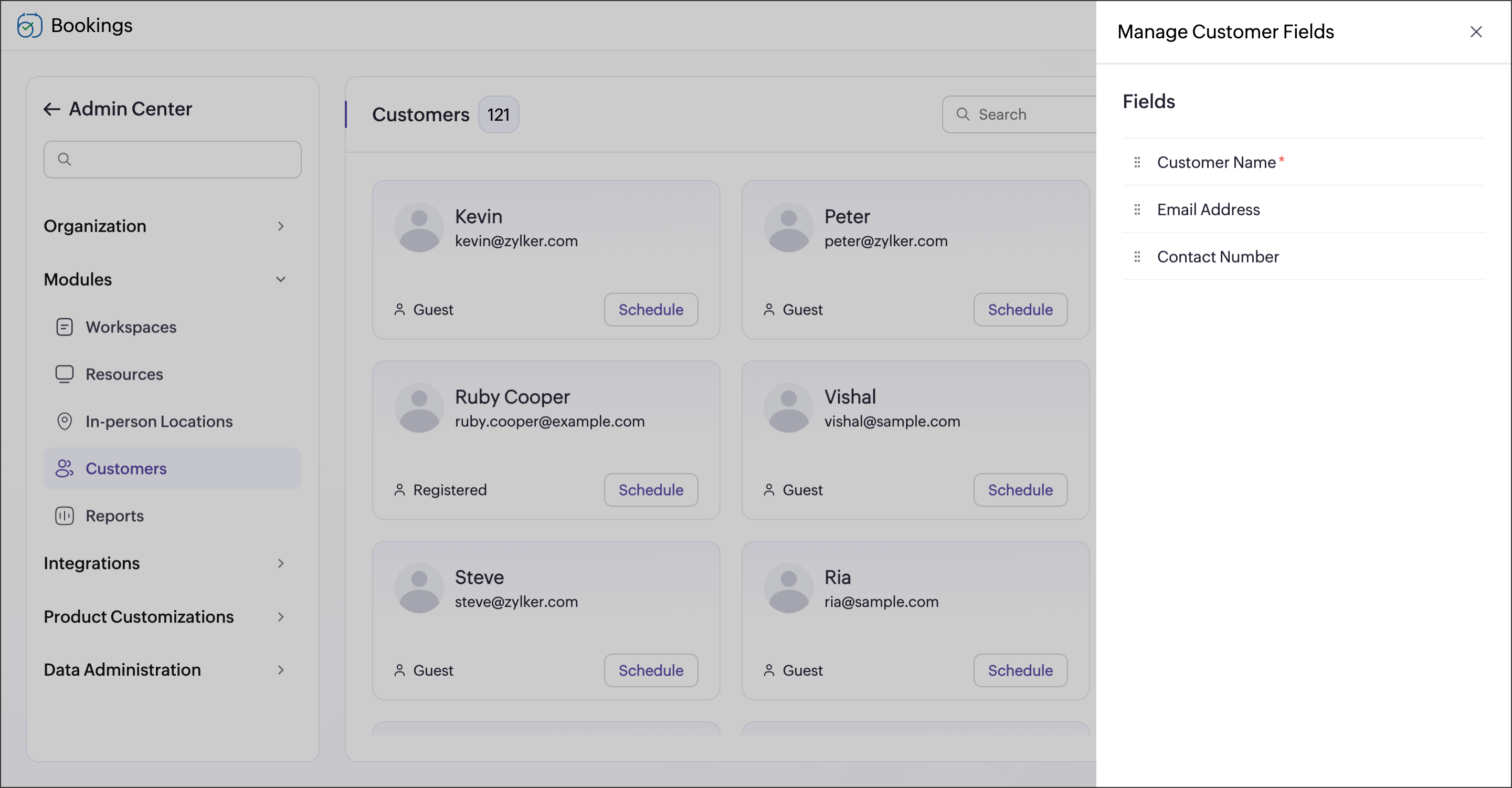 in the top-right corner of the Bookings menu bar. - Select Customers under Modules. You can see the list of customers.
