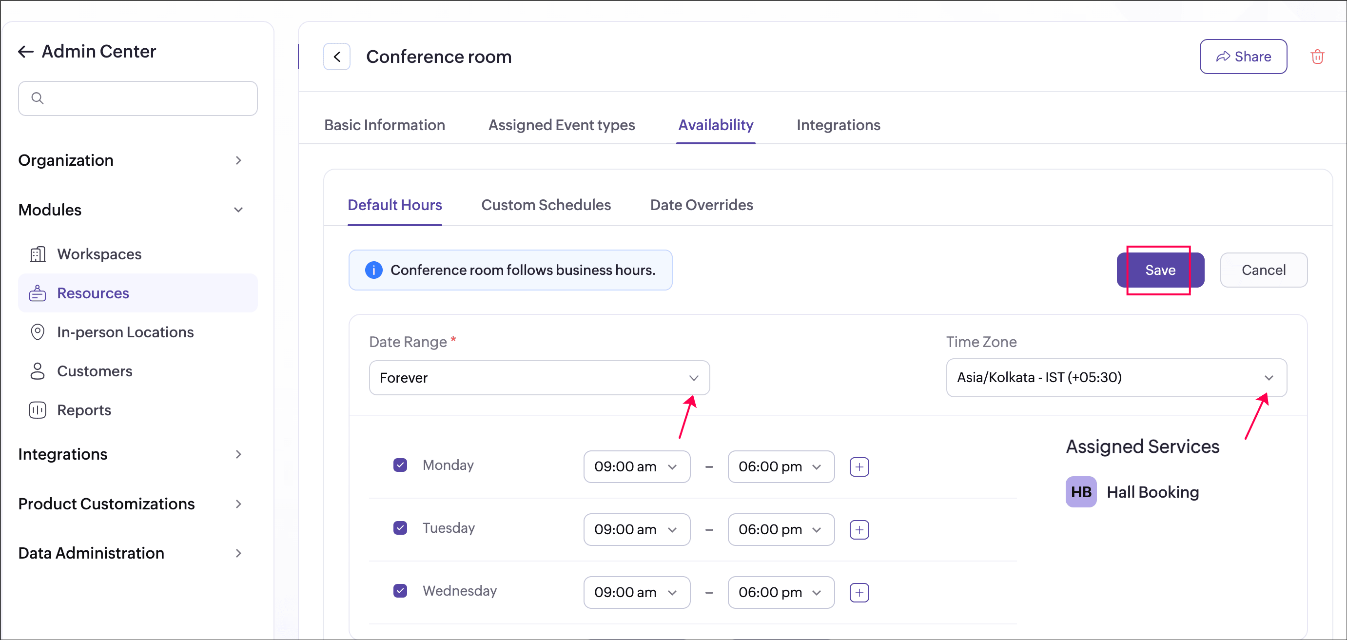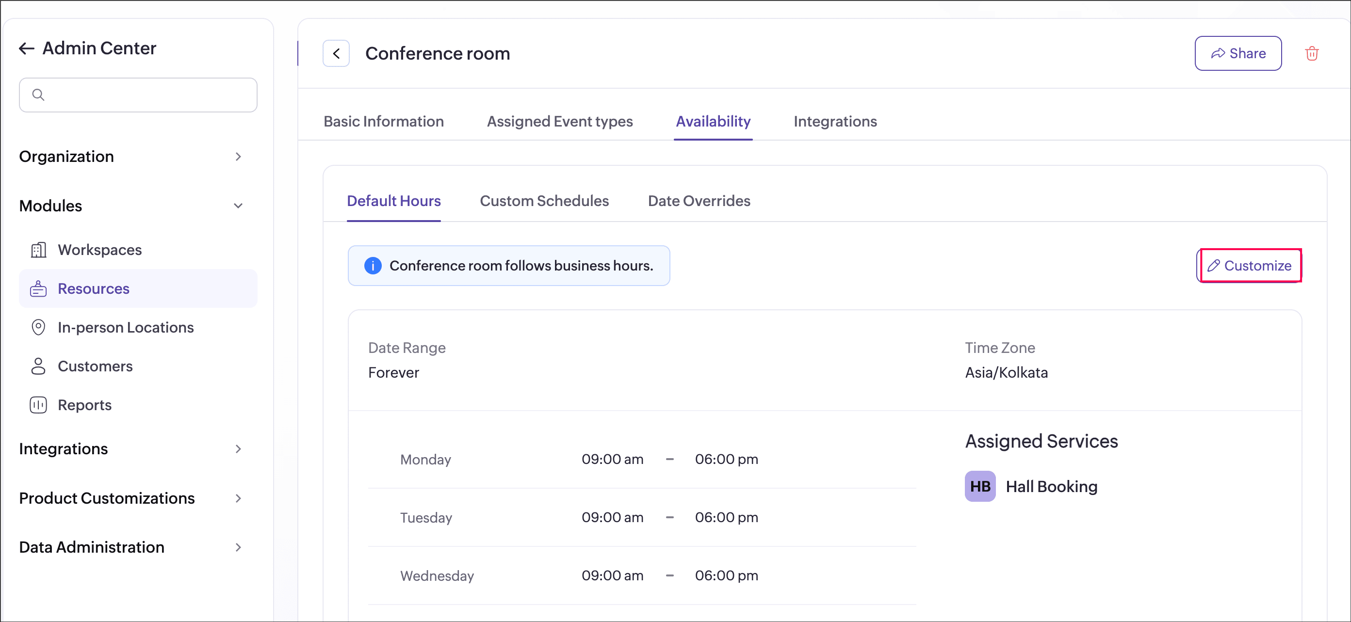 Click Customize to set or update the resource’s default hours.