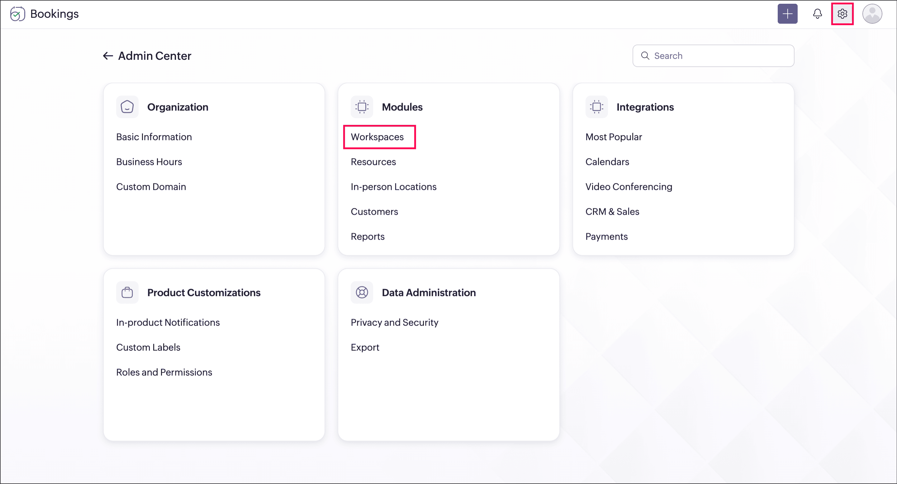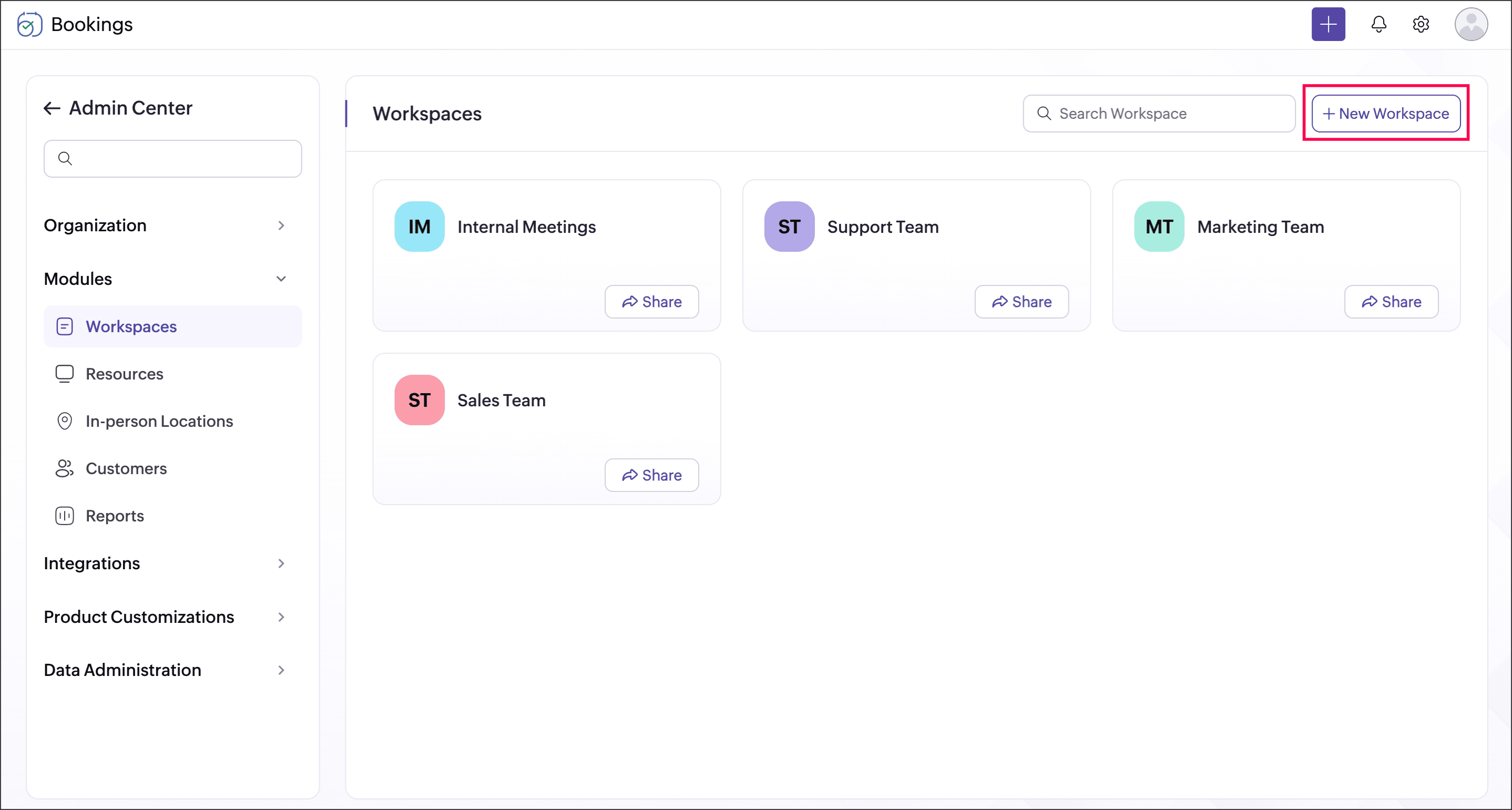 This page is applicable for Bookings 2.0 version only. To view the equivalent Bookings 1.0 version, please check this page.Workspace is a virtual space where you can group related event types together, similar to a department. For example, Marketing Calls can be a workspace, and you can add all the marketing meetings in it like Introductory Call and Product Demo. It acts as a container to group all event types.