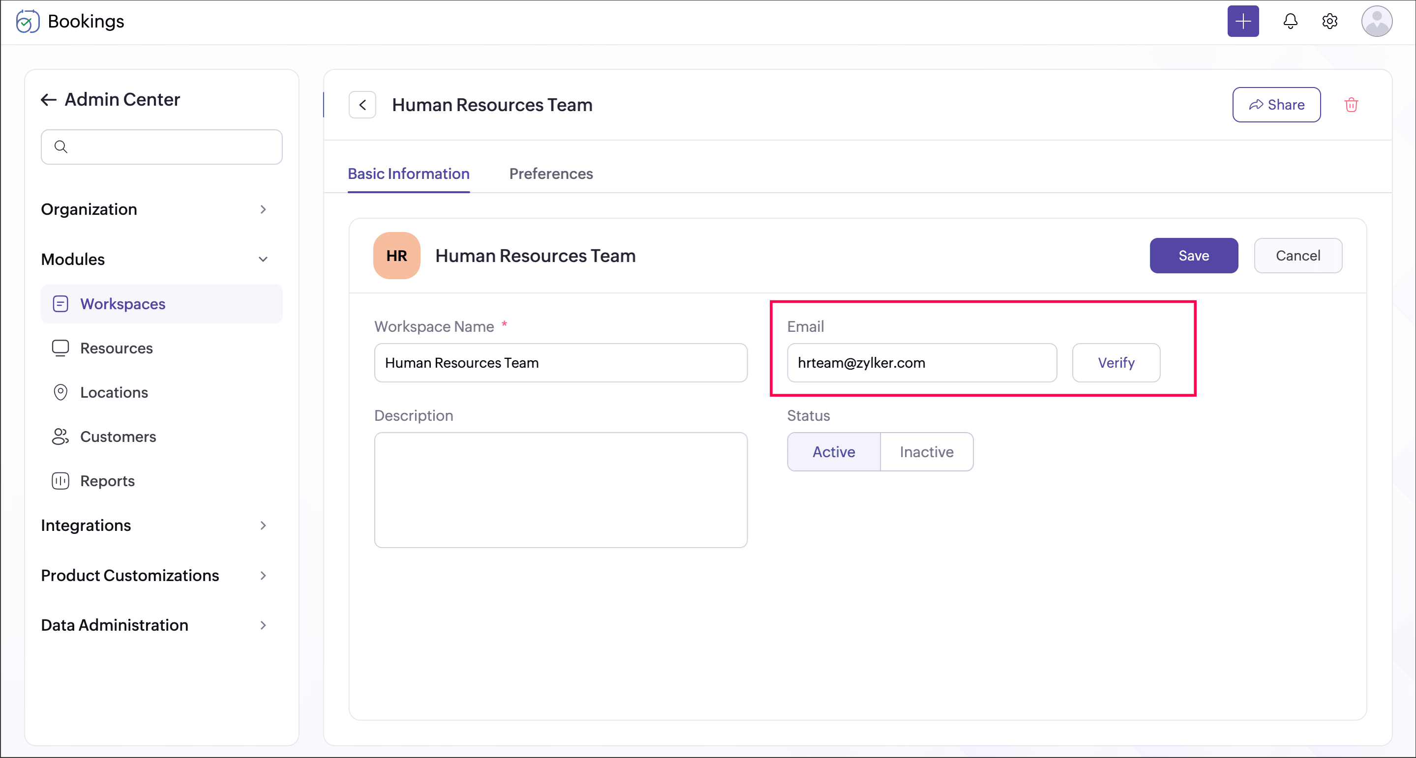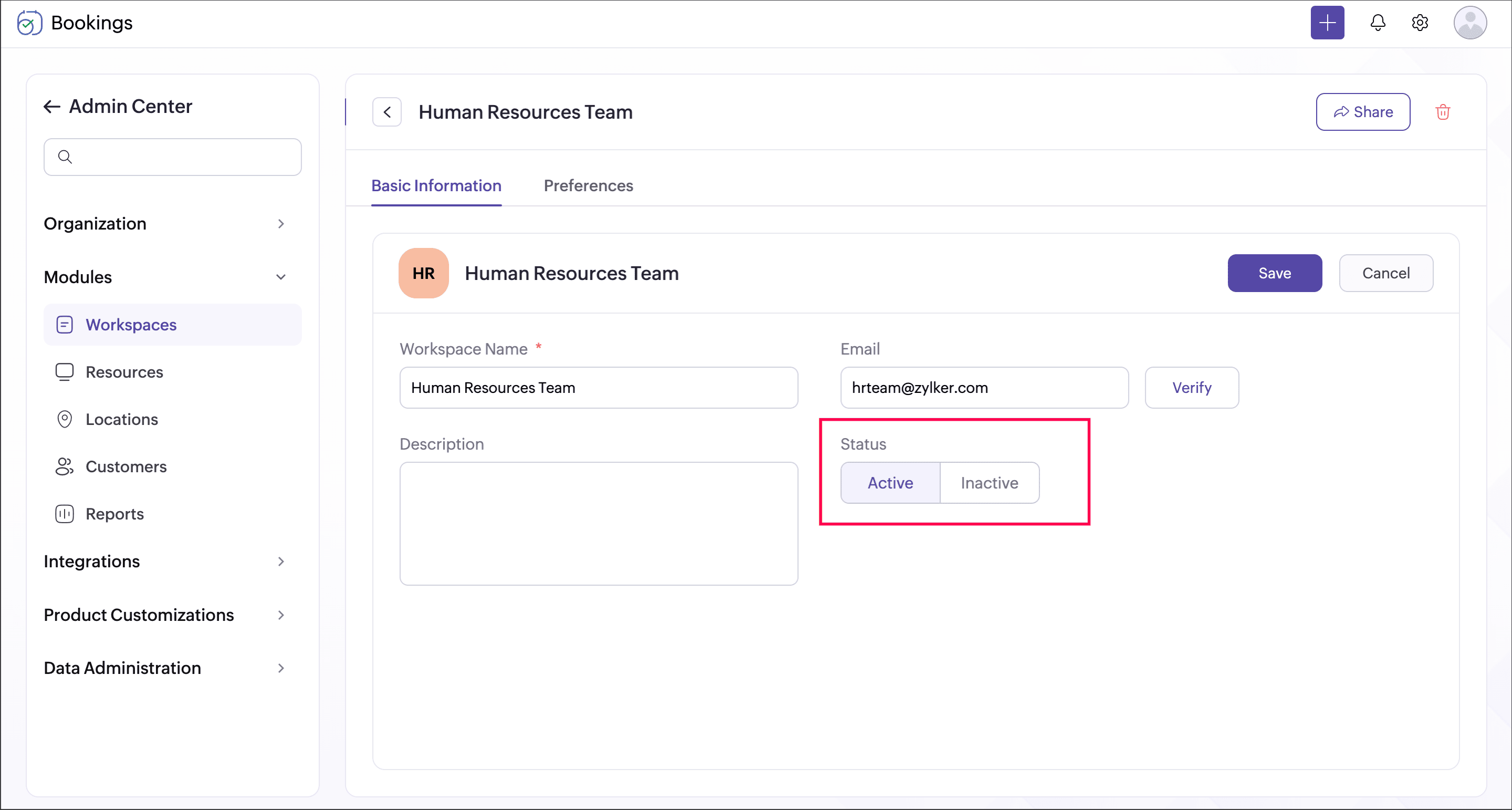 Note: The workspace email address added will be applied as the sender email only if configured from the Notifications tab.You can set a workspace as active or inactive. Making a workspace inactive will make all its event types inactive, thereby appointments cannot be booked.