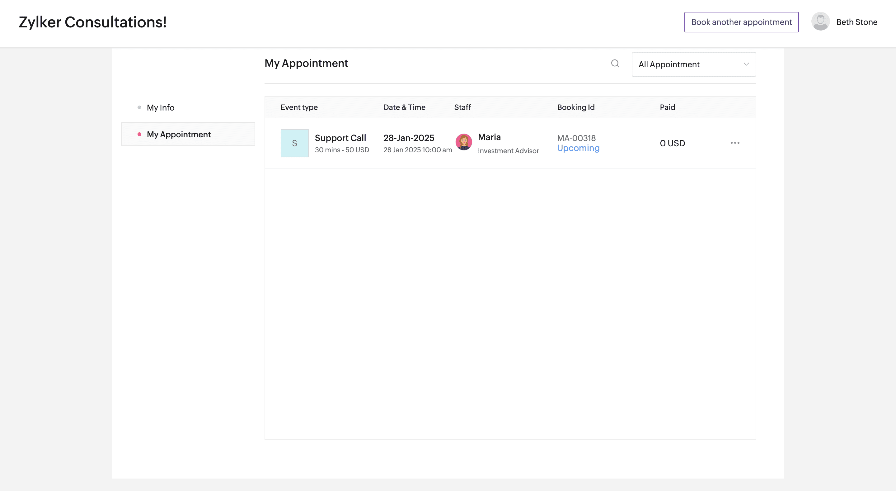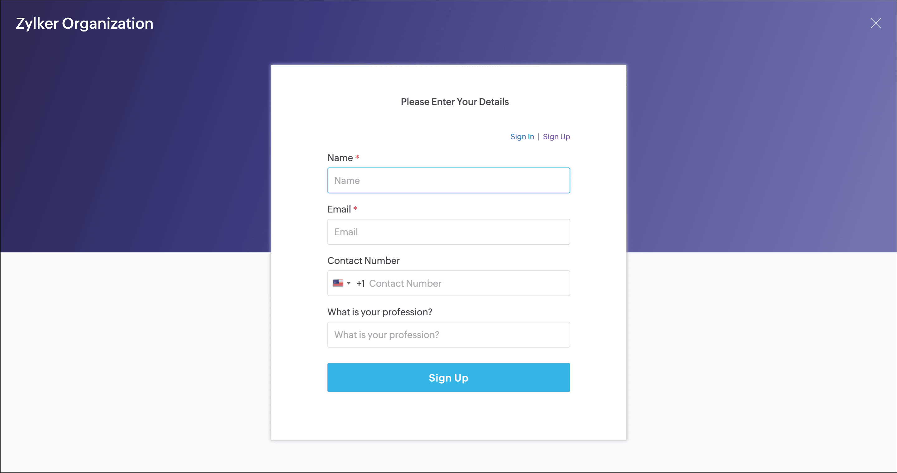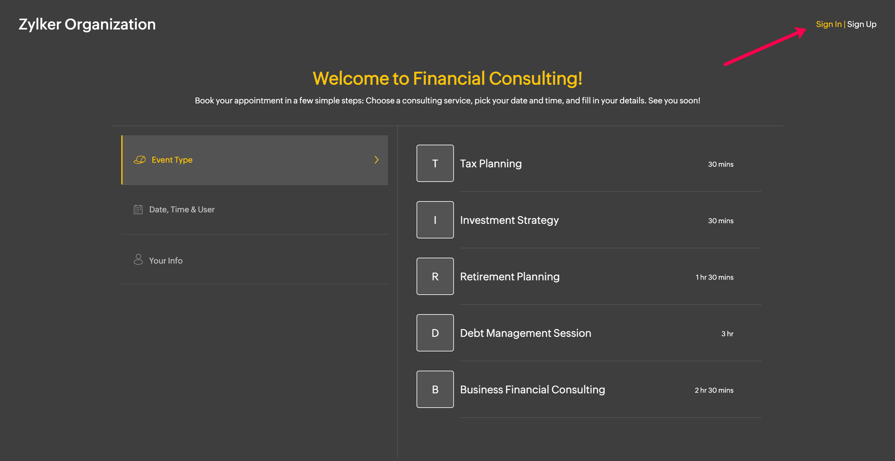 In the booking page, customers can be given an option to sign up and register themselves. Once they register, they can sign in to the customer portal and perform various actions like booking an appointment, rescheduling, canceling, and viewing their appointment details. When they register, you can collect information in the sign up form that gets added to the customer module.