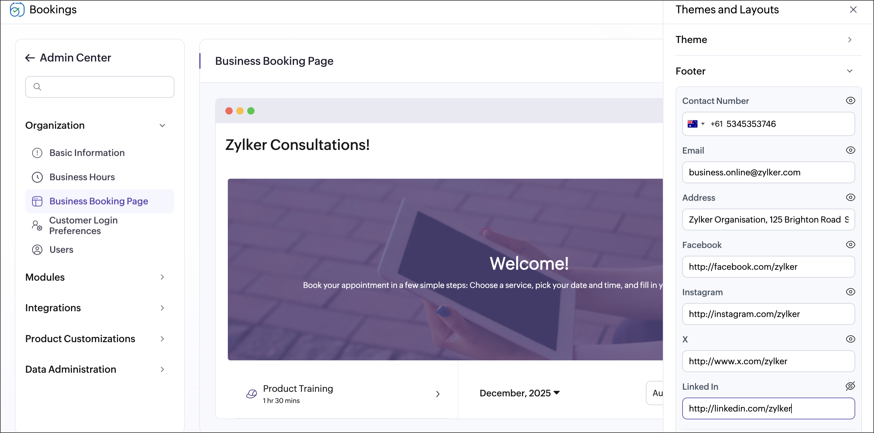 You can set the footer of the booking page so customers can view information about your business, such as the contact number and social media links of your business.