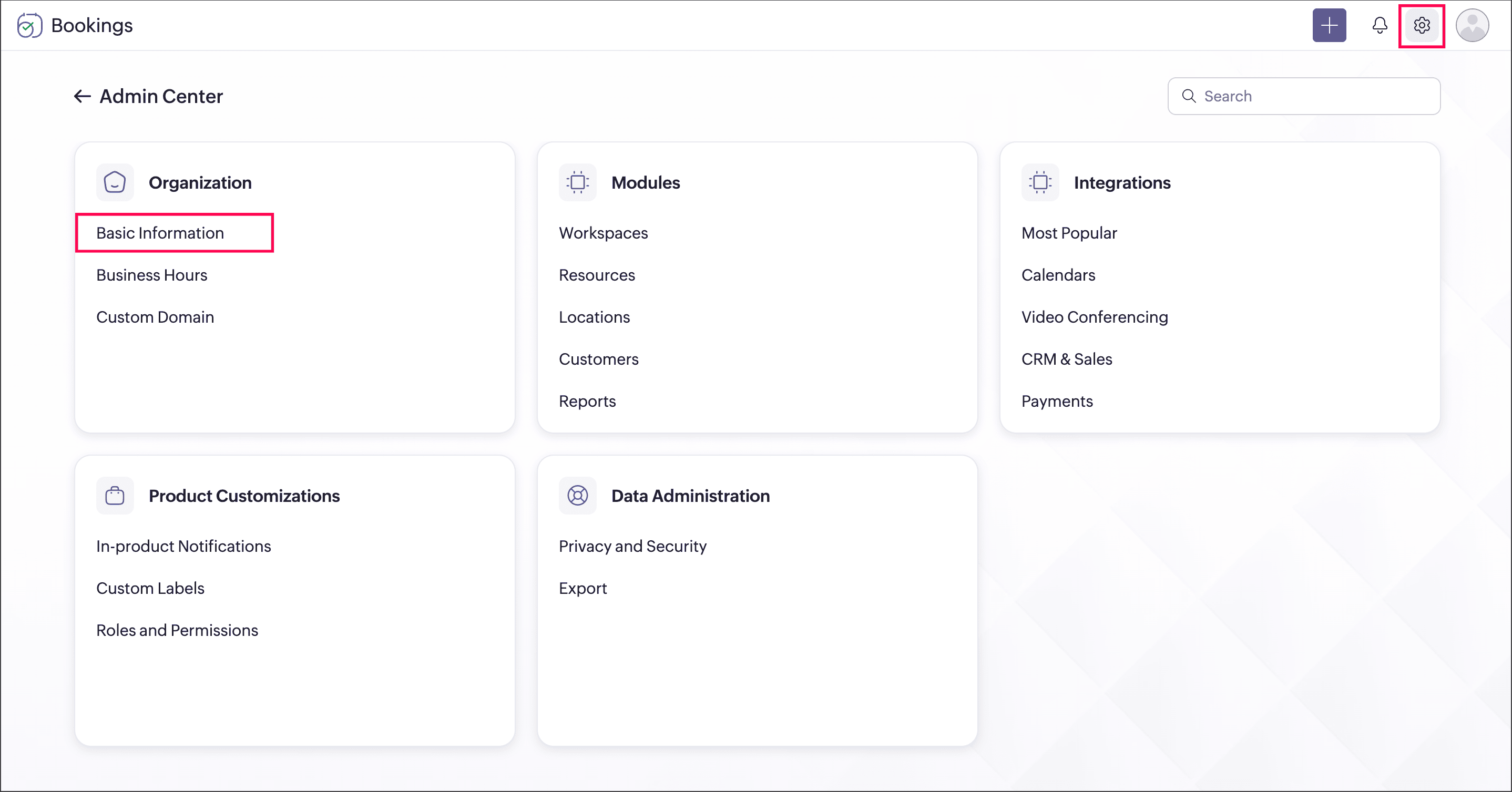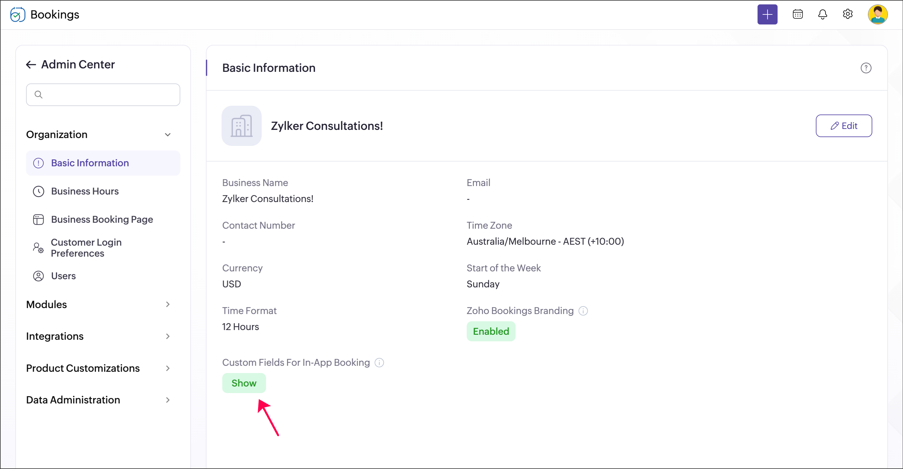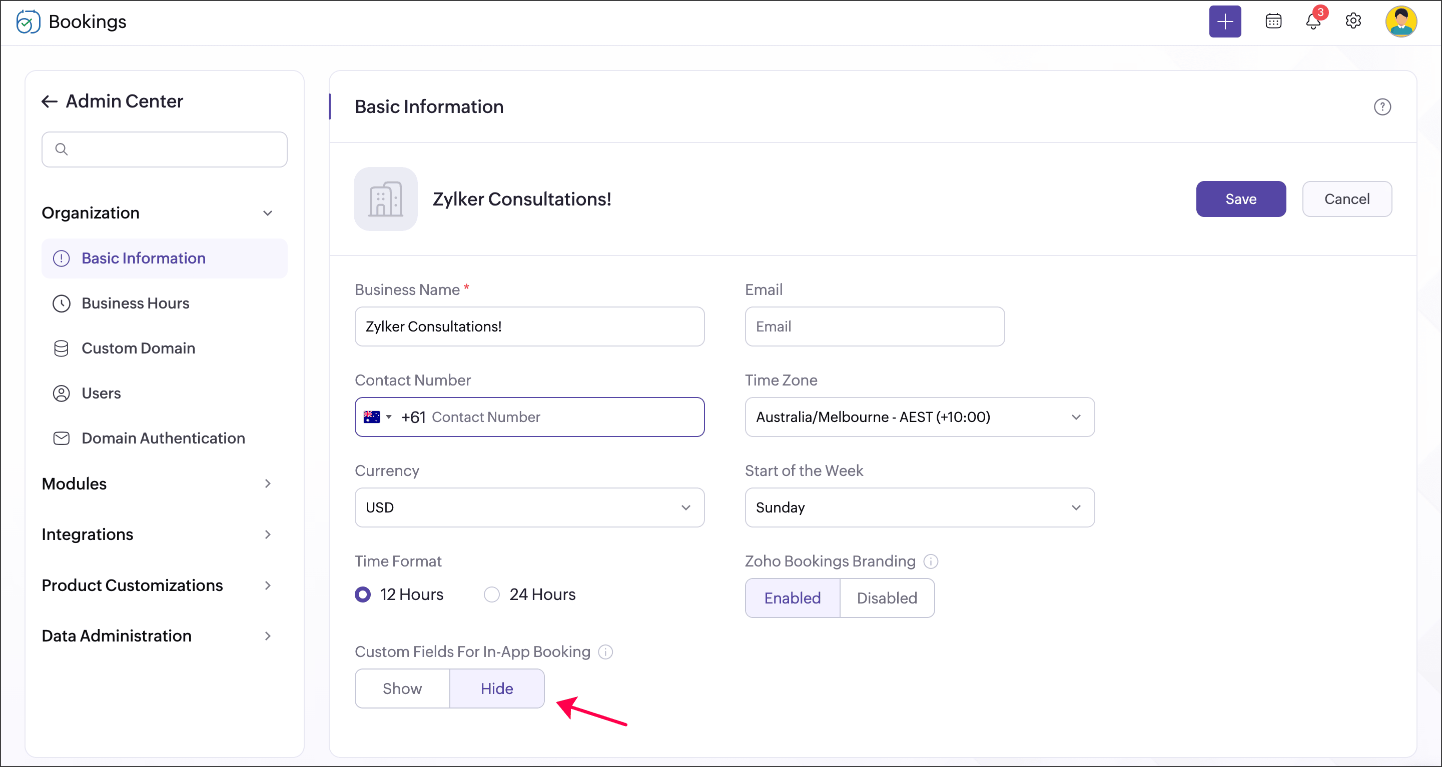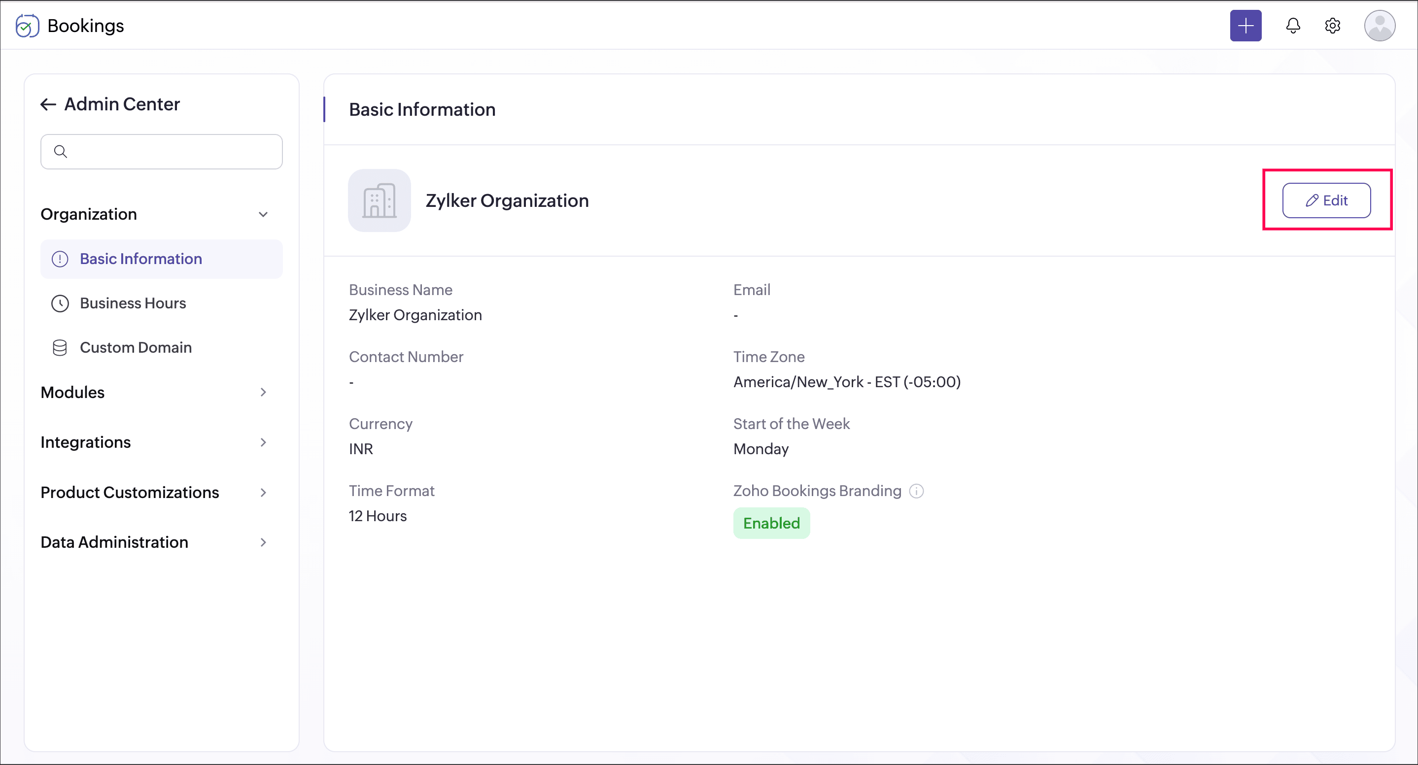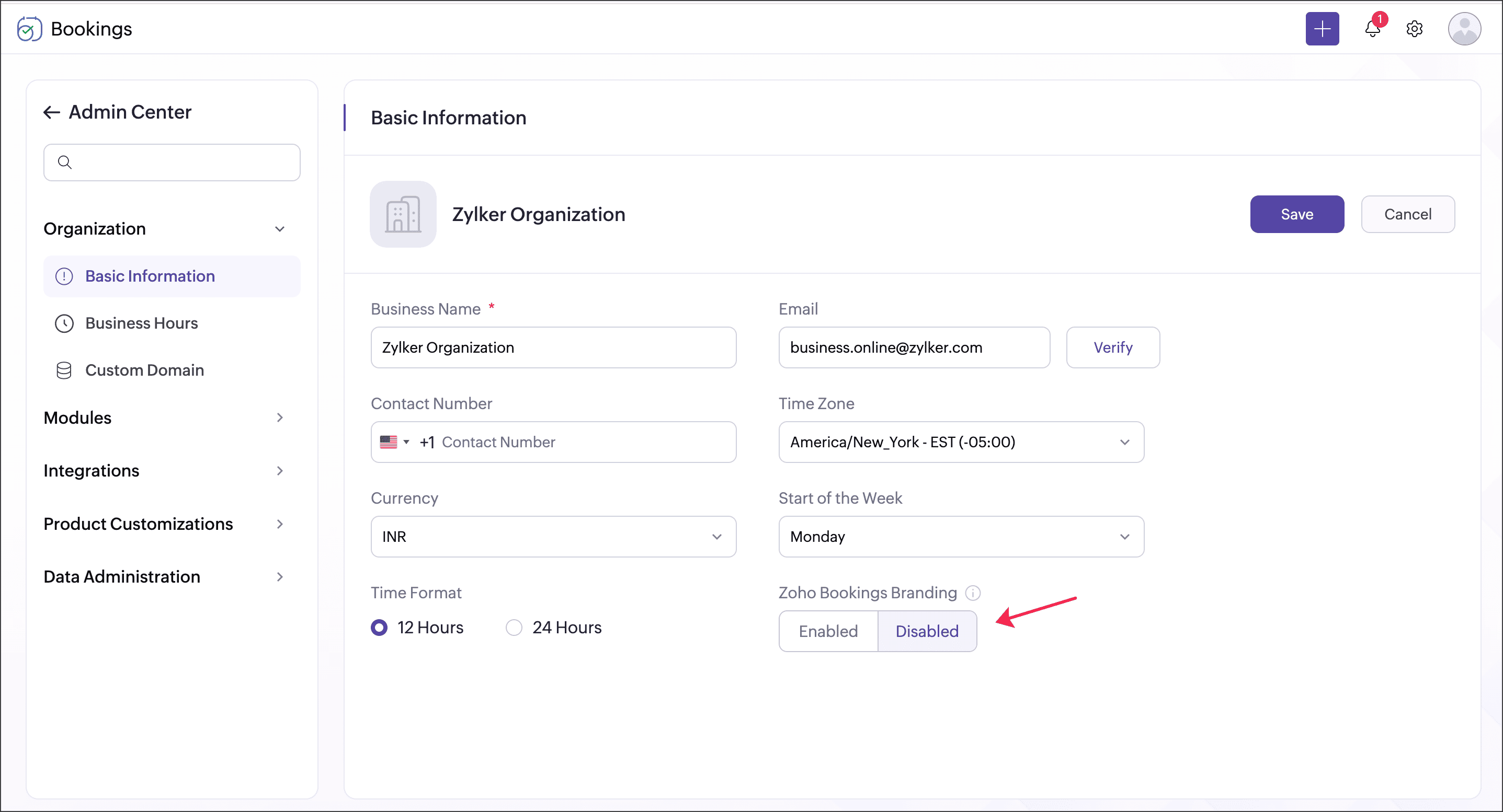 Basic Information of your organization contains all the fundamental details about your business, including the business name, contact number, and email address details. Additionally, it has timezone, time format, and currency details that are applied throughout the Bookings org. It has the Zoho Bookings Branding option, which can be enabled to remove the Powered by Zoho Bookings text on your booking pages.