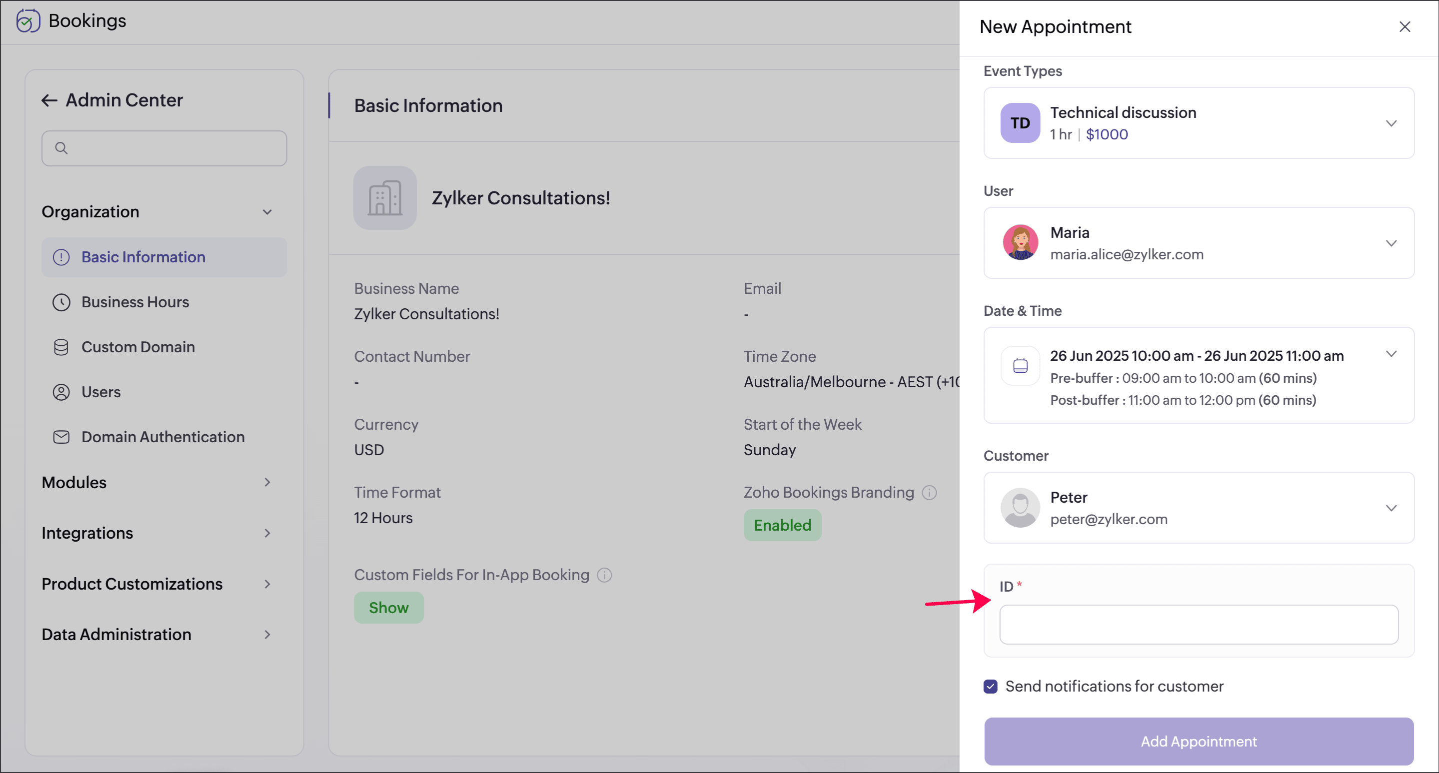 This option allows you to include custom fields like company name, customer id etc when adding appointments within the application for your customers.