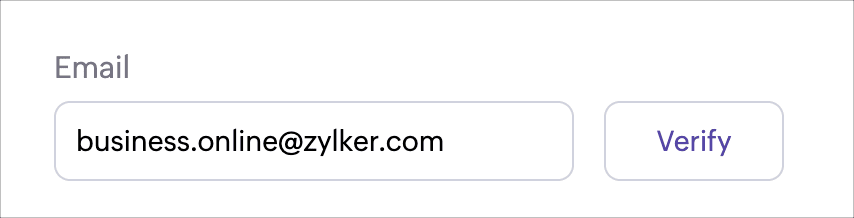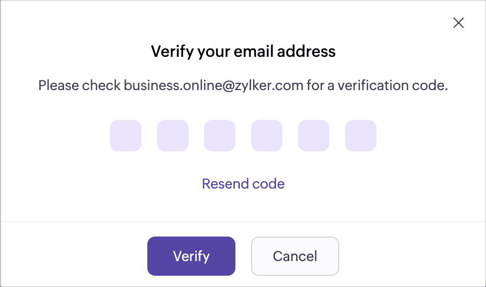 - Enter the 6-digit verification code that is sent to the required email address and click Verify. The verified email address will be added as a business email.