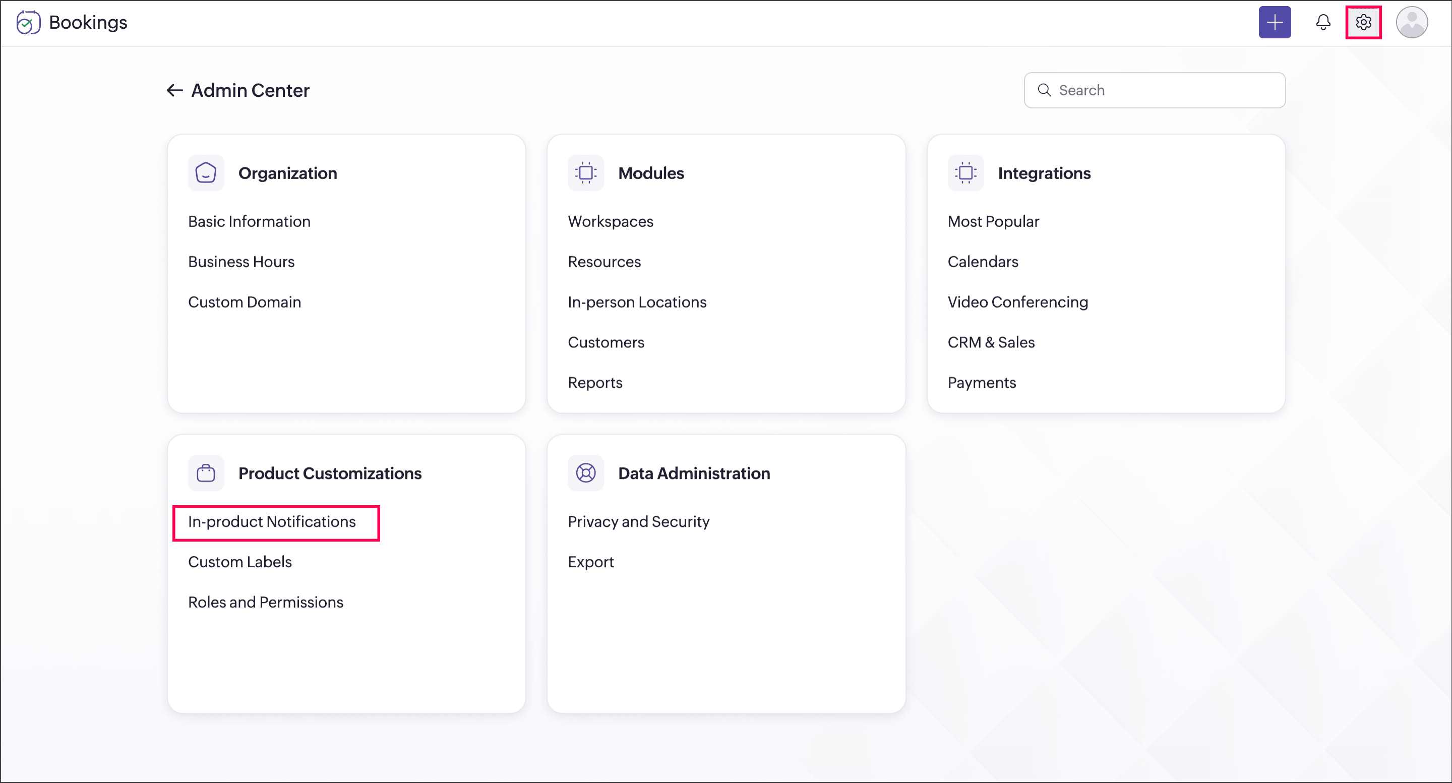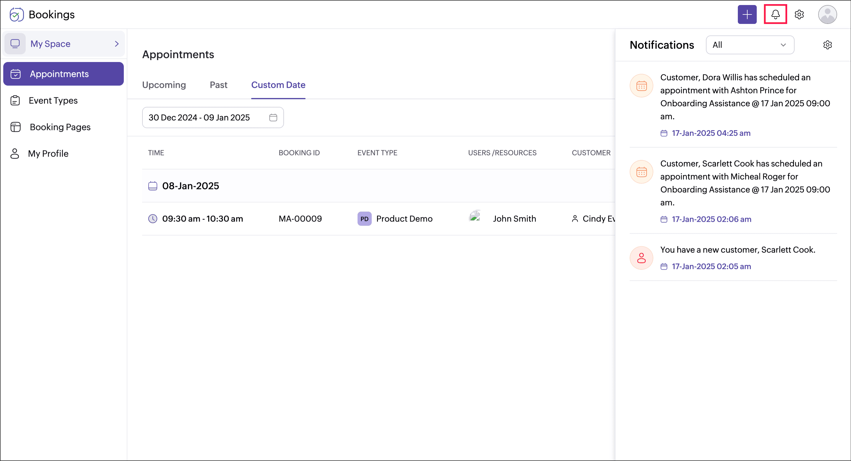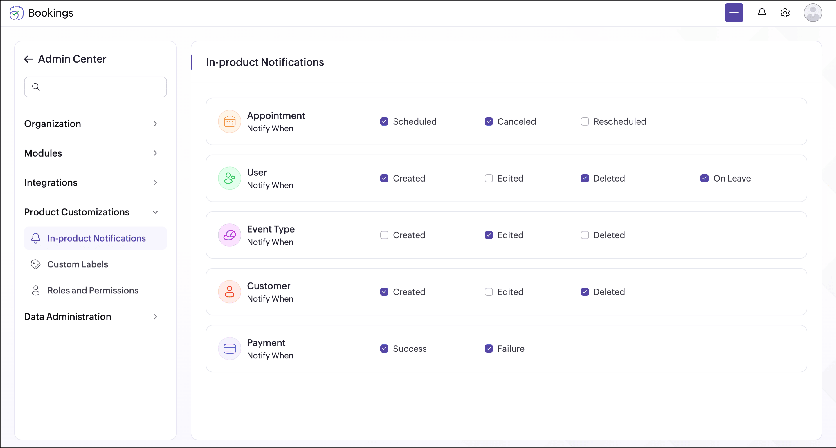 In-product notifications are alerts shown within the Bookings product that inform users about changes in appointments, customers, users, event types, and payments. Admins can setup which changes should trigger notification, and all other users will receive those notifications.