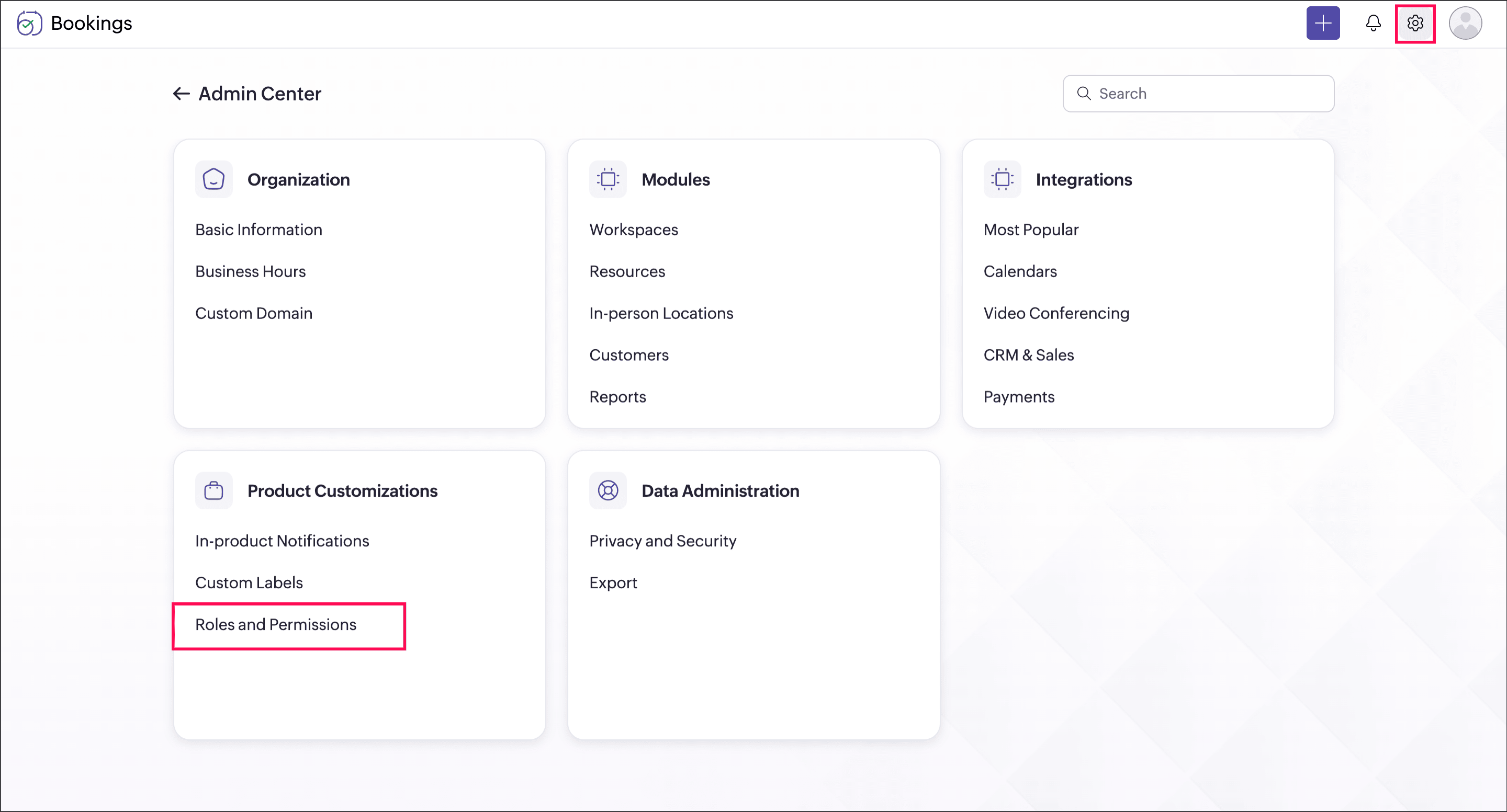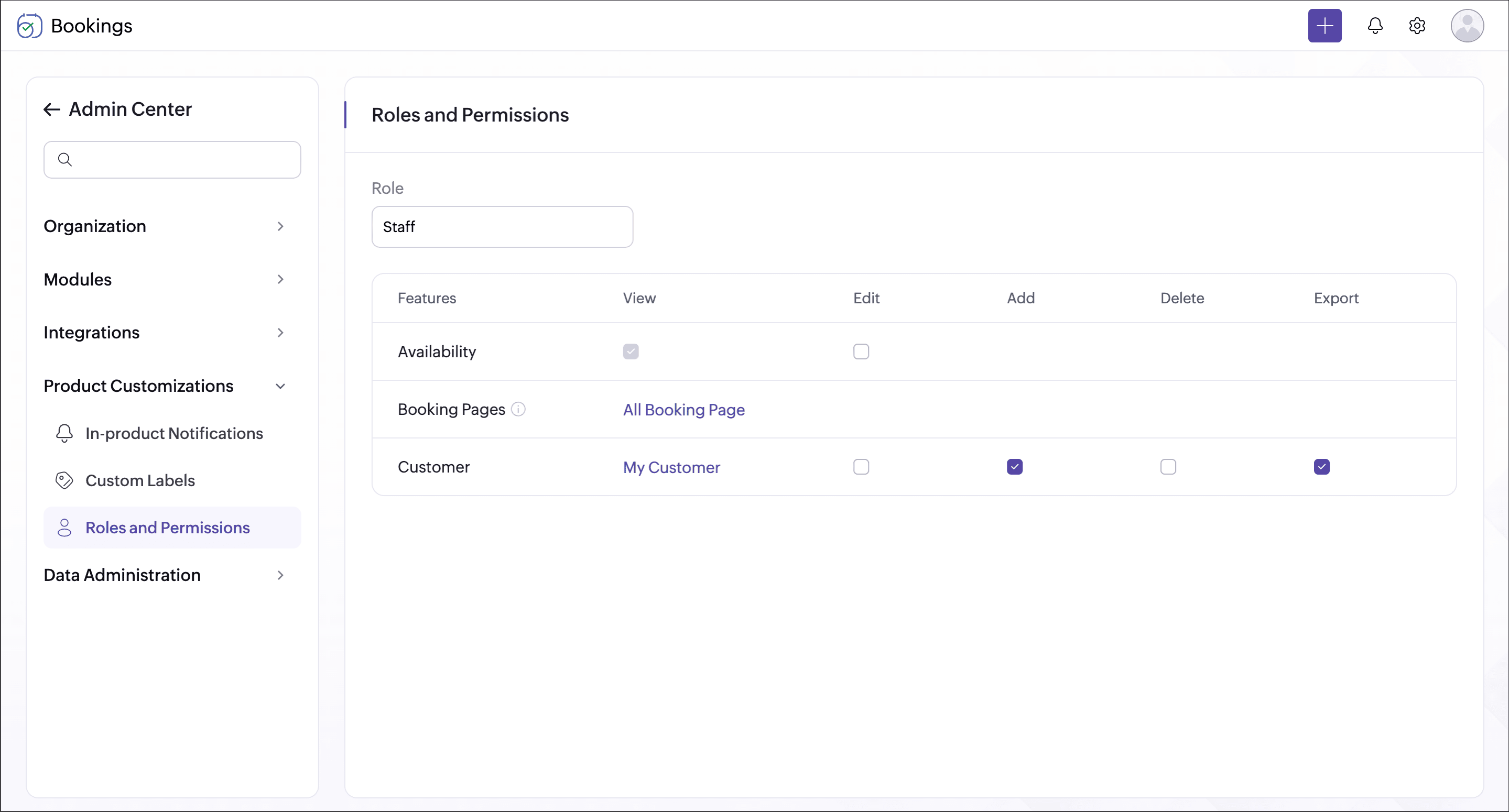 Bookings offers five types of roles, each with predefined permissions. These permissions can be modified to suit your preferences and ensure privacy by defining their access levels and responsibilities.