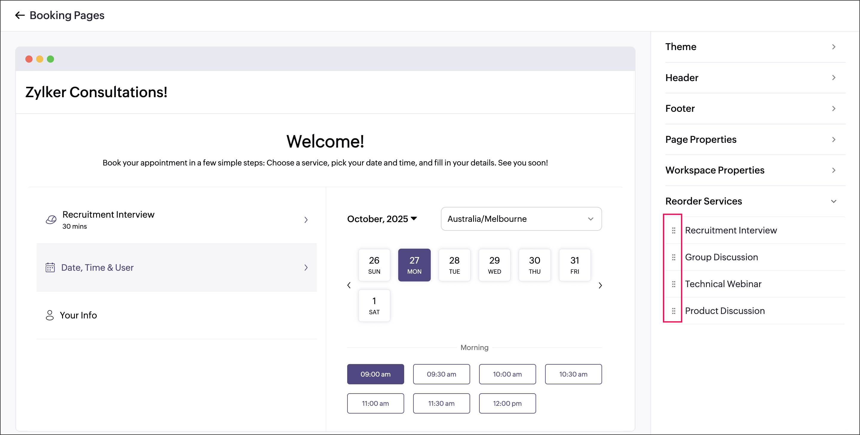 A workspace booking page groups all the event types that are offered within a workspace. You can set theme, header, footer, page title, description, background image, language, and customize the booking page to reflect your business theme.