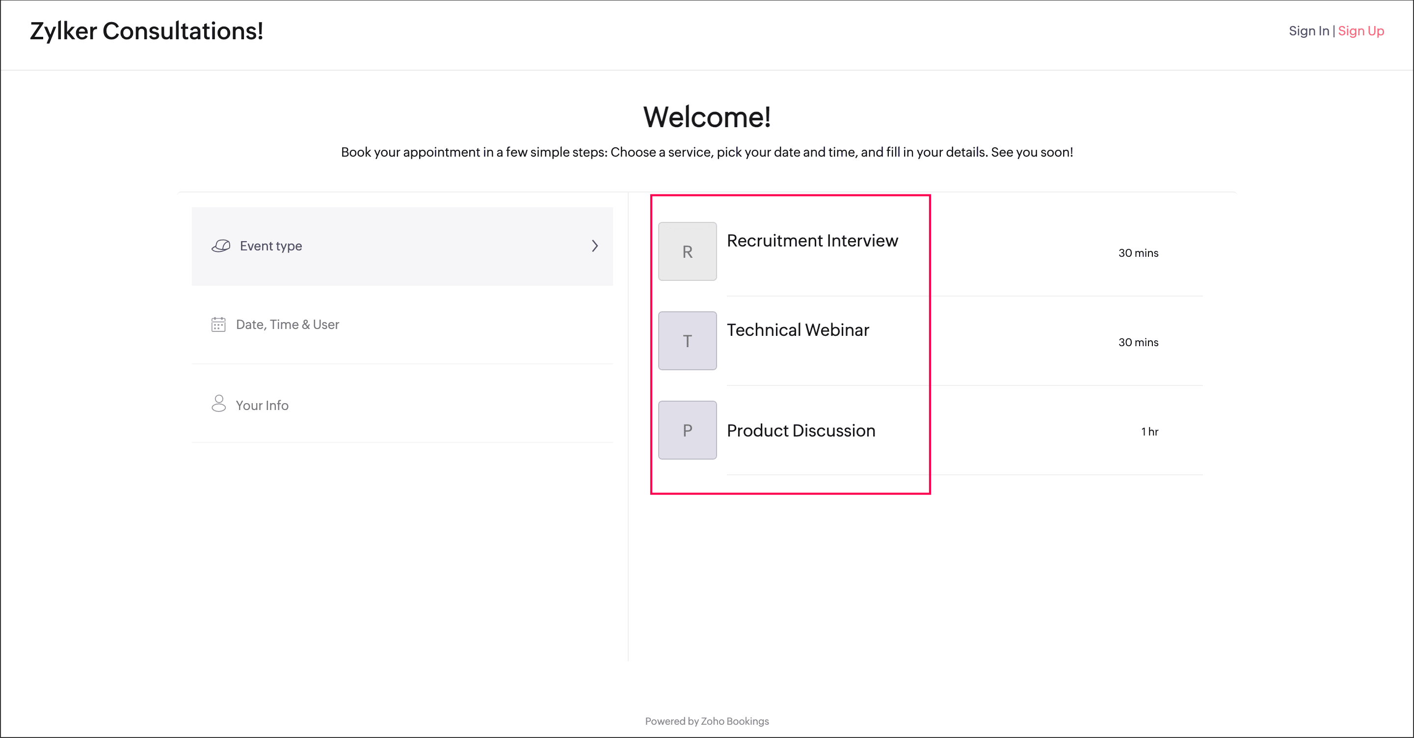 You can reorder event types to define how they appear on your booking page. This helps you highlight important event types, control their display order, and make navigation easier for your customers. For example, if you offer multiple event types, you can move frequently-booked ones, such as consultations or training sessions, to the top of the list, so customers can find and book them more easily.