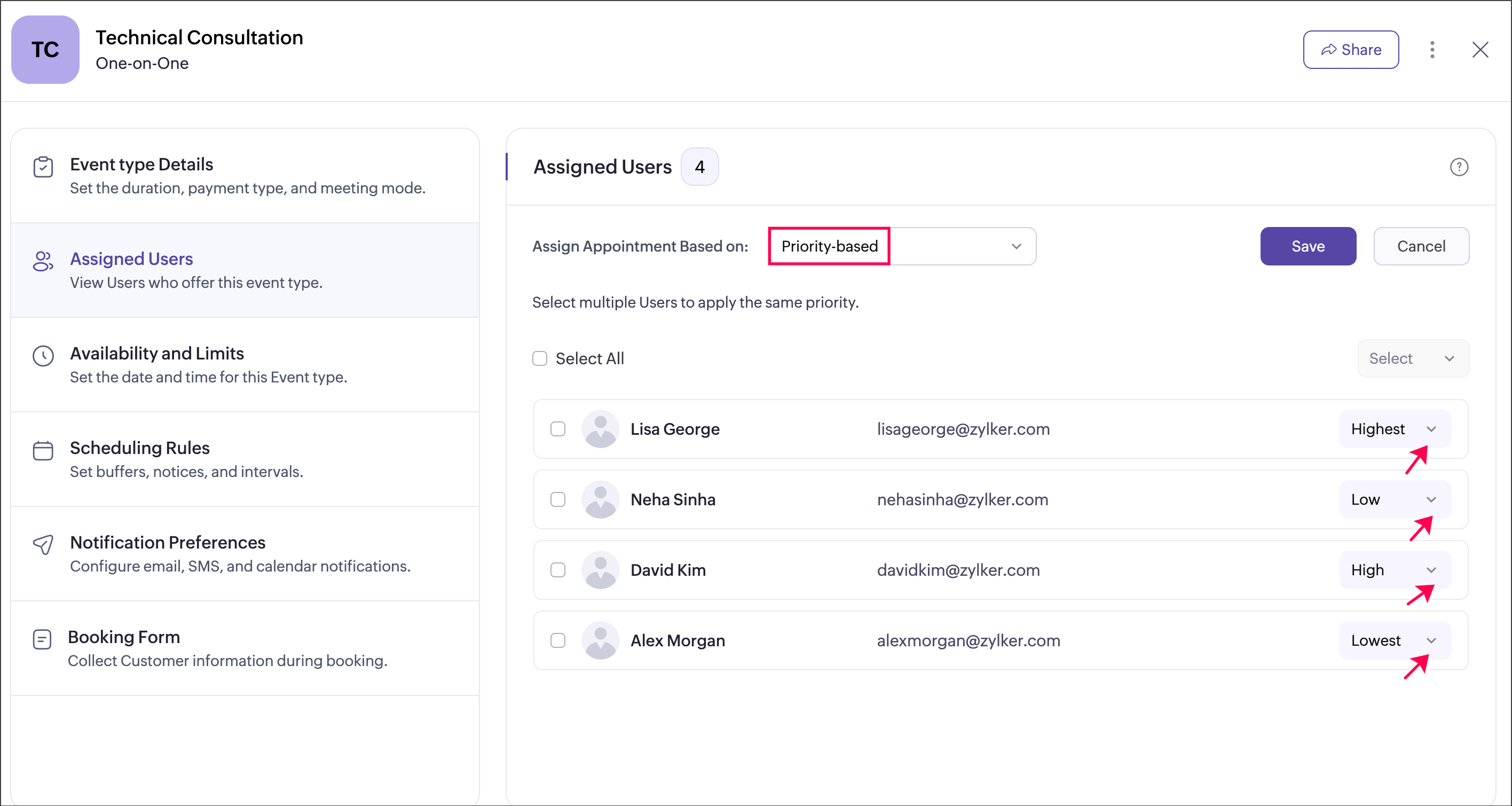 Distributes appointments for the event type based on assigned priority tiers: Highest, High, Low, or Lowest. Users in higher tiers receive a larger share of bookings, while users within the same tier share appointments equally. Priority-based is suitable when senior members, specialists, or primary users should receive more bookings, while others function as secondary or backup resources.