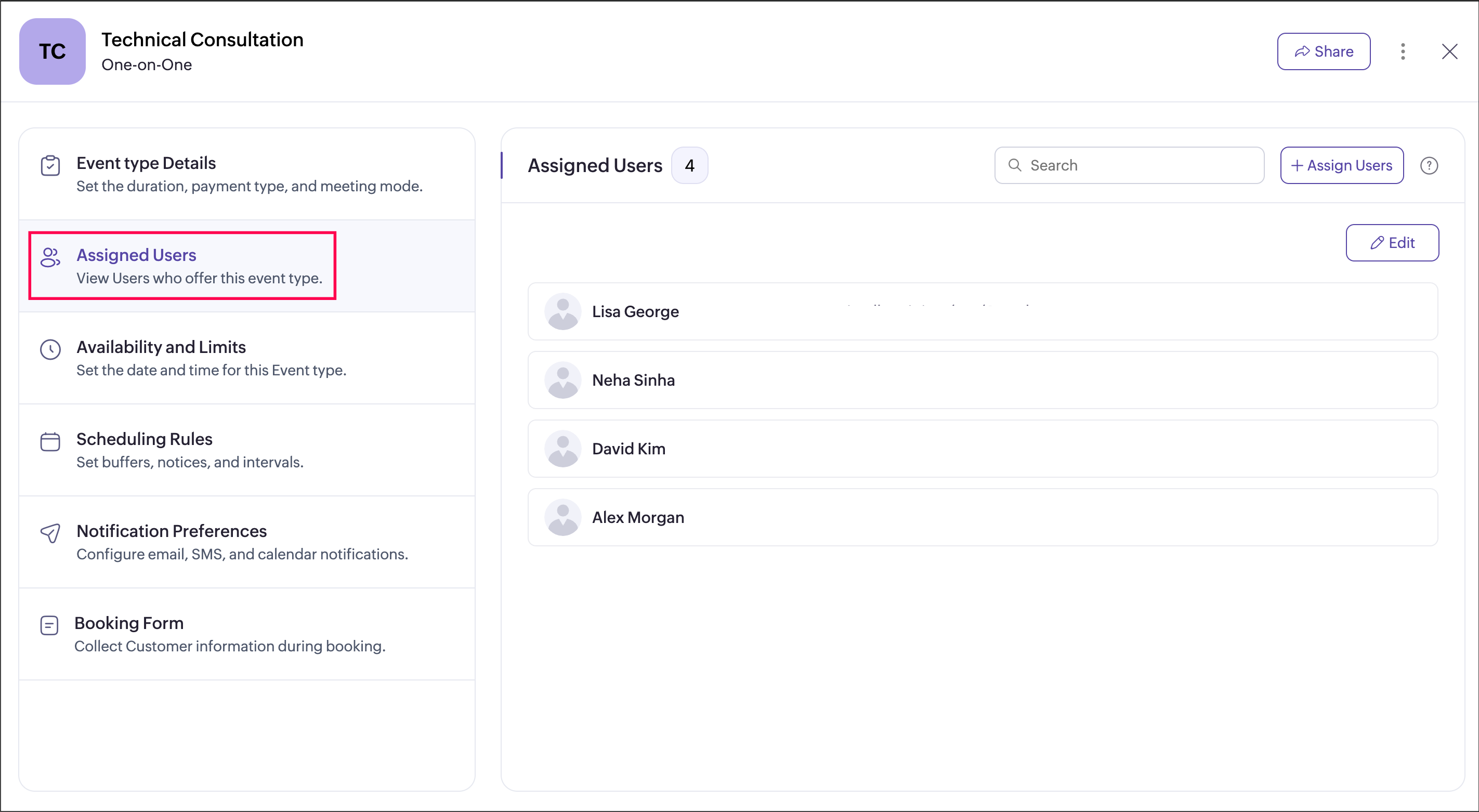 Go to the required workspace and click Event Types, and select the Assigned Users tab in the left side pane. Here, you can view the list of users assigned for the event type.