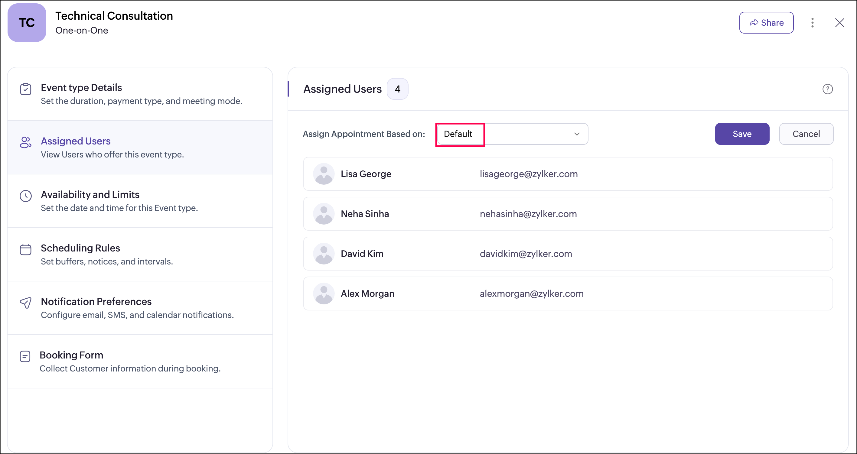 Appointment Distribution determines how appointments are allocated among the users. By default, appointments are assigned considering all event types. Appointment Distribution allows you to define different distribution methods independently for each event type and applies to the active users assigned to that event type who are available at booking time. Zoho Bookings supports the following distribution methods: