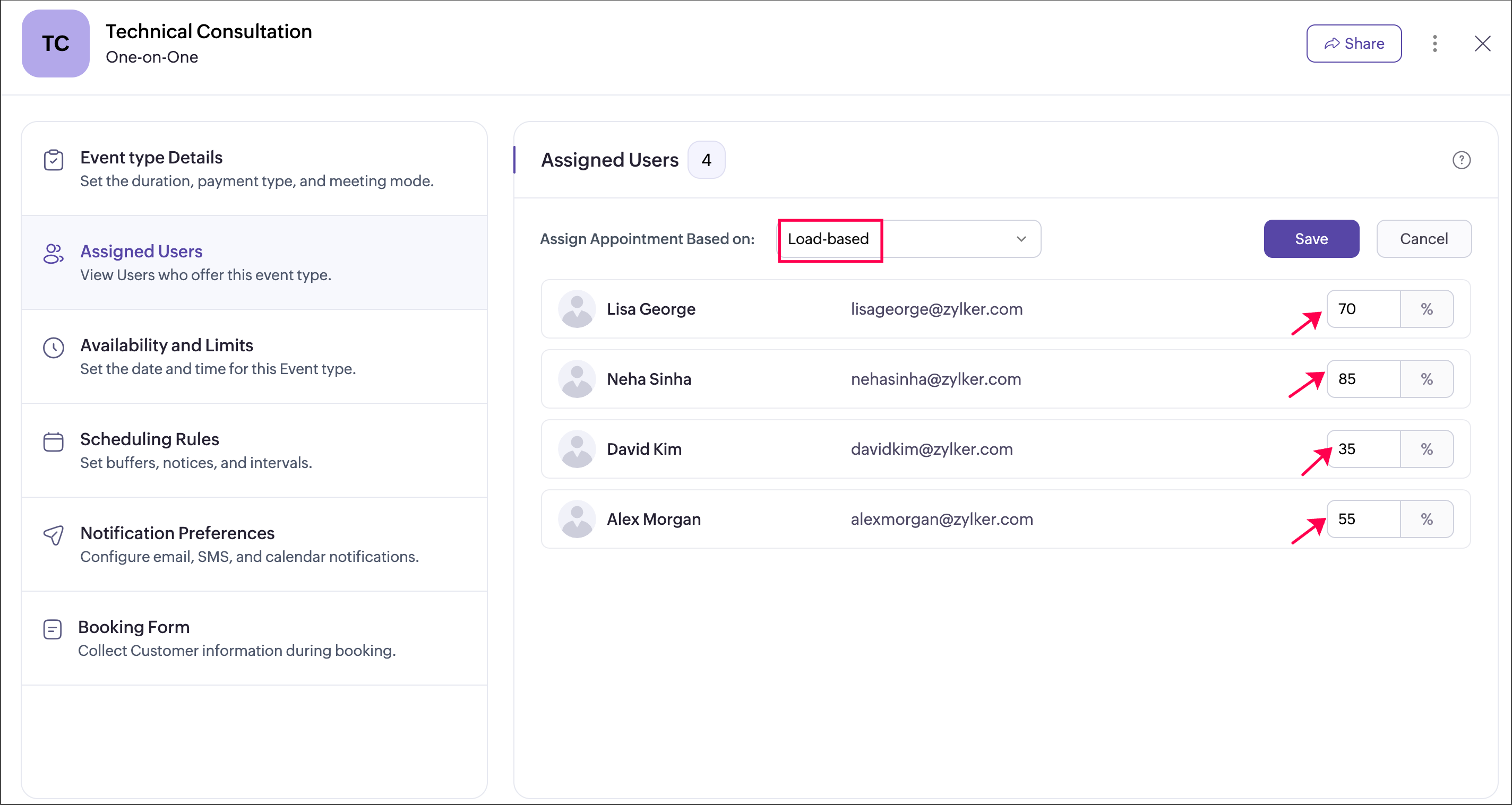 Distributes appointments for the event type proportionally based on configured weight percentages assigned to users. Users with higher weights receive more appointments while maintaining proportional balance. Load-based is suitable when users have varying capacities or when workload needs to be managed in defined proportions.
