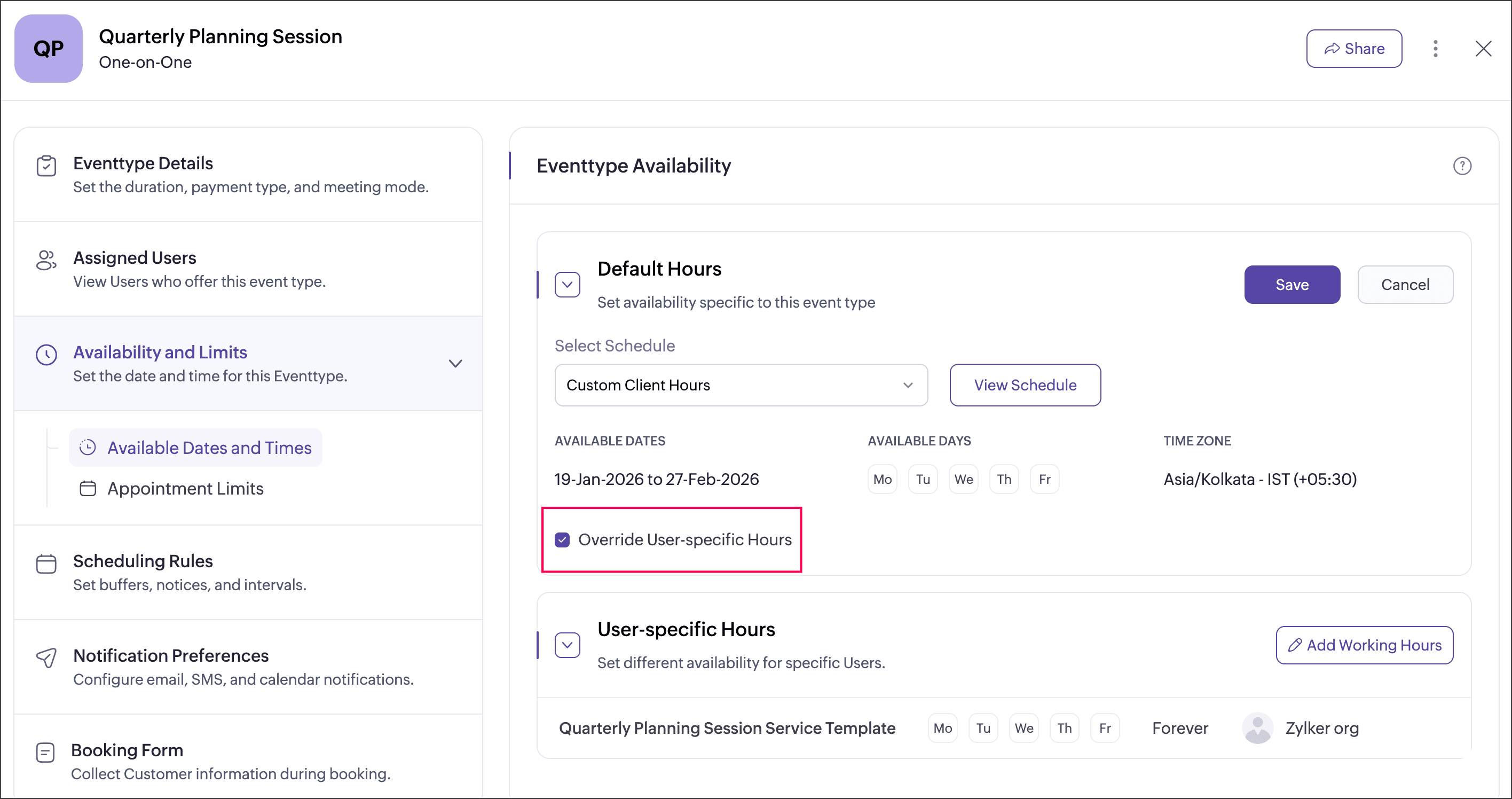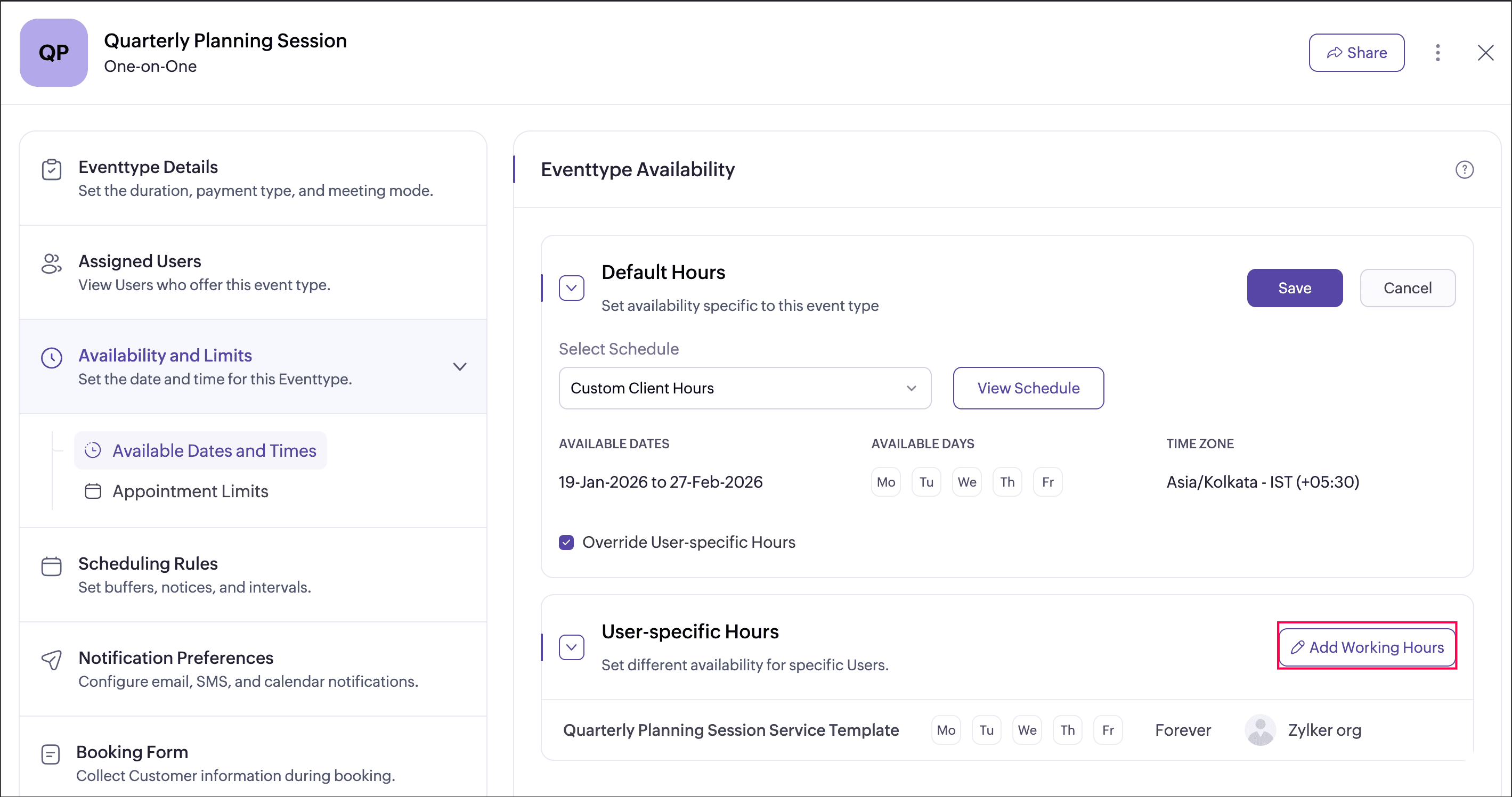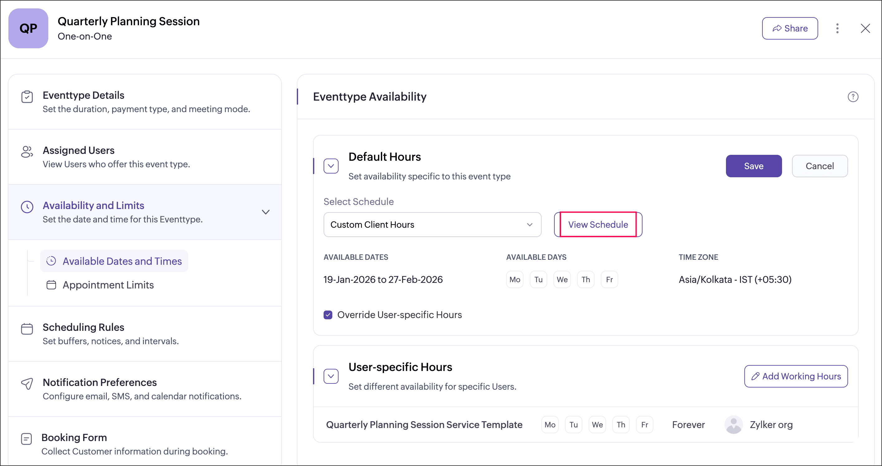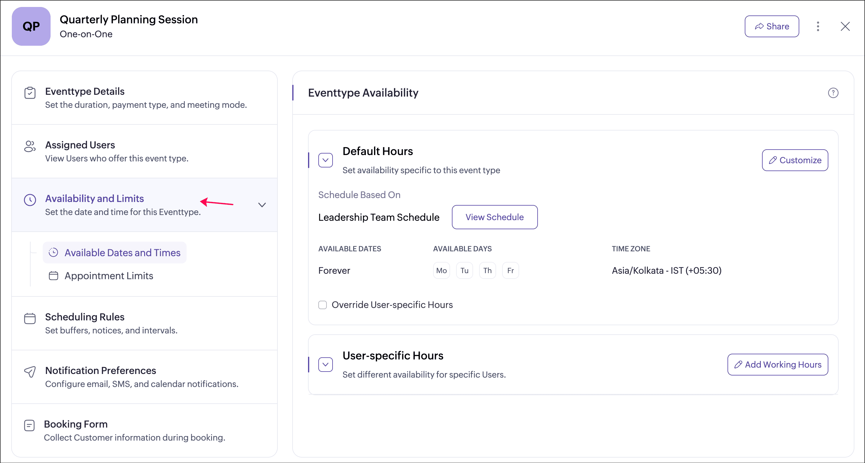 User-specific hours allow you to define a separate schedule for selected users within an event type. This helps when certain users need different availability from the default event type schedule. You can add multiple user-specific schedules for an event type, each applied to different users or groups of users. These schedules apply only to that event type and do not affect the users’ availability in other event types.