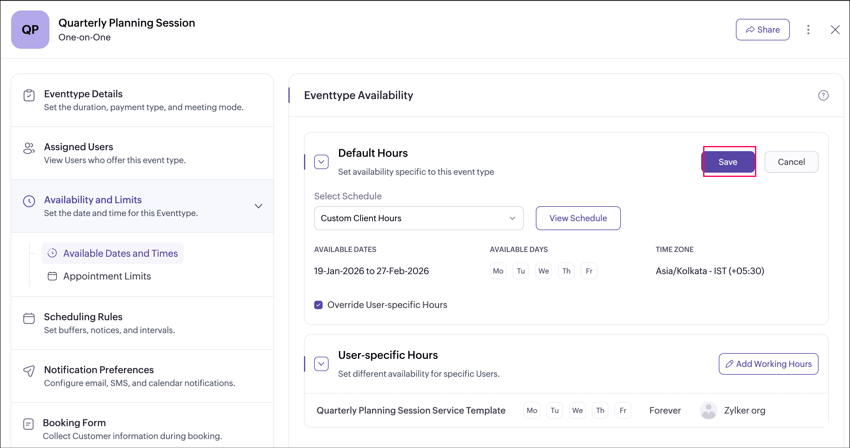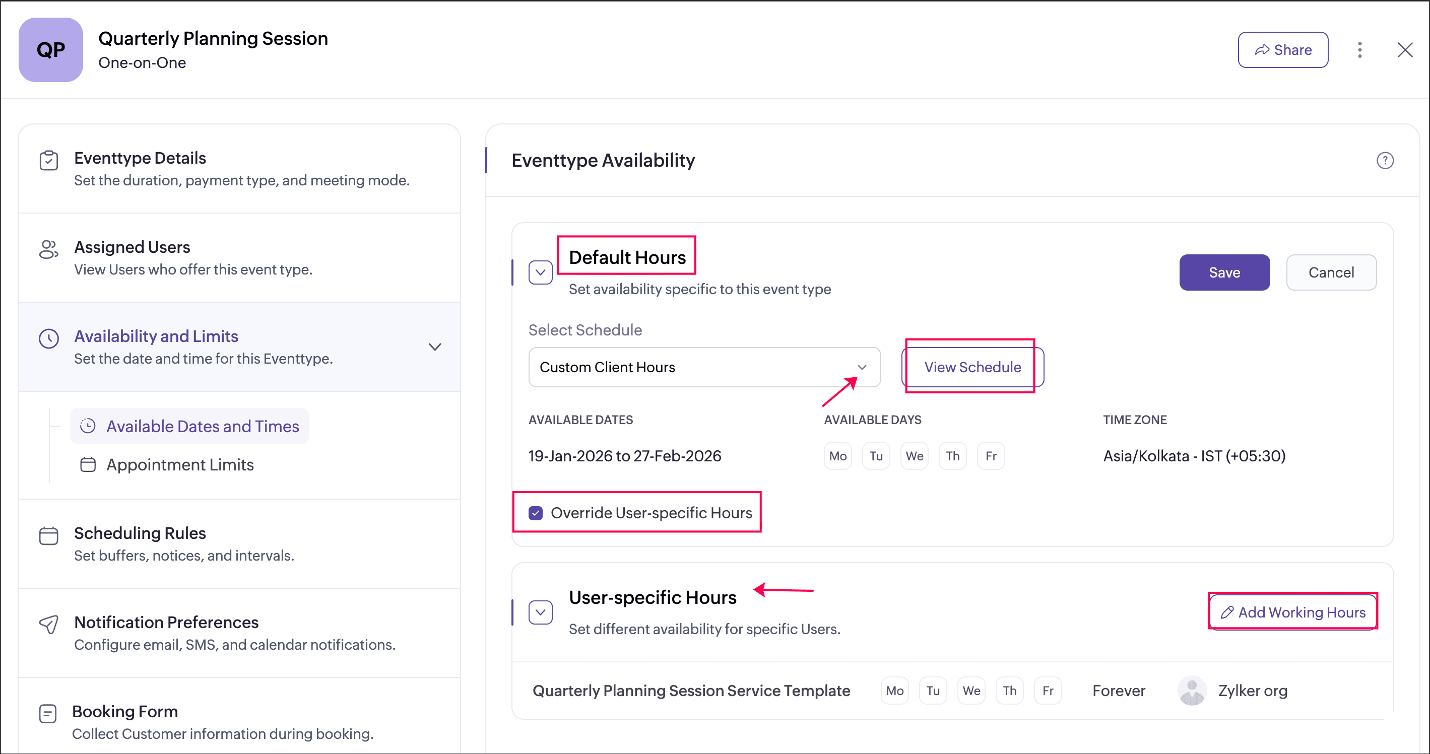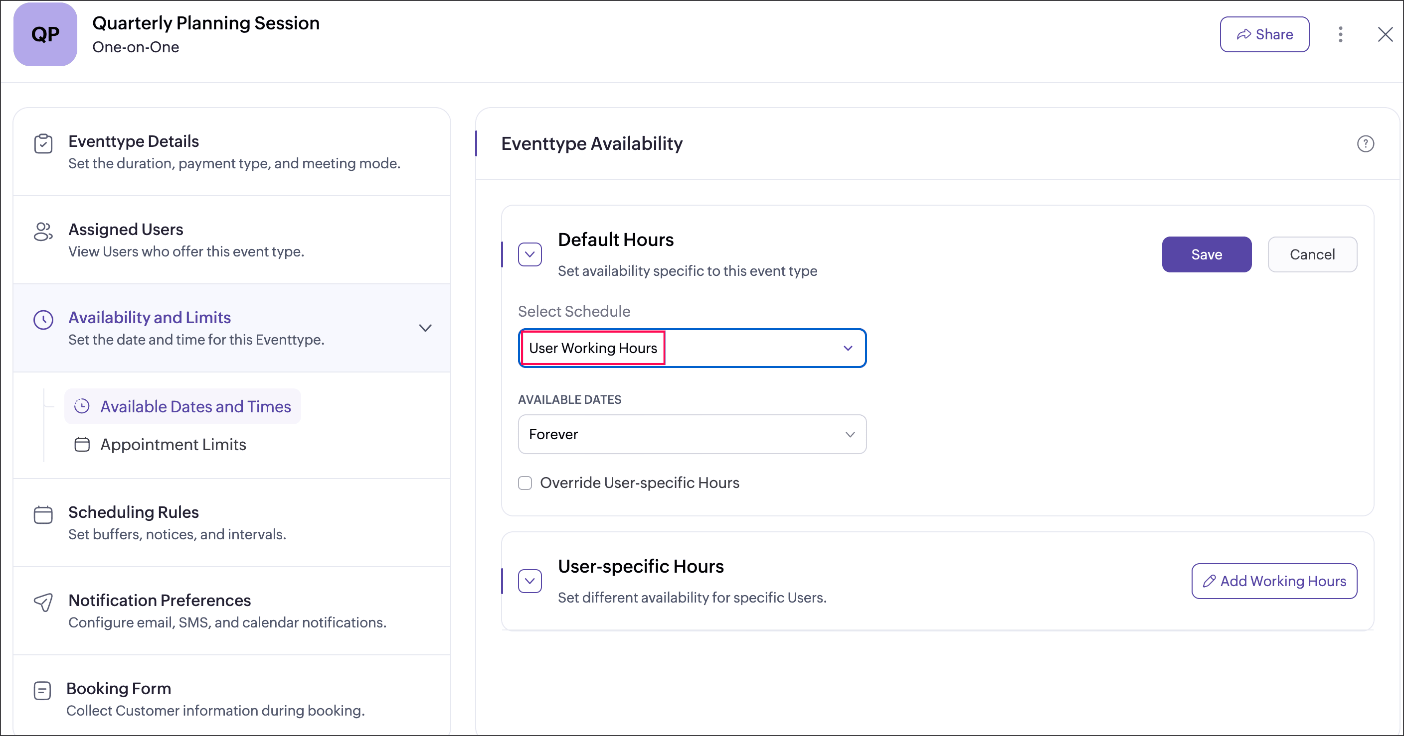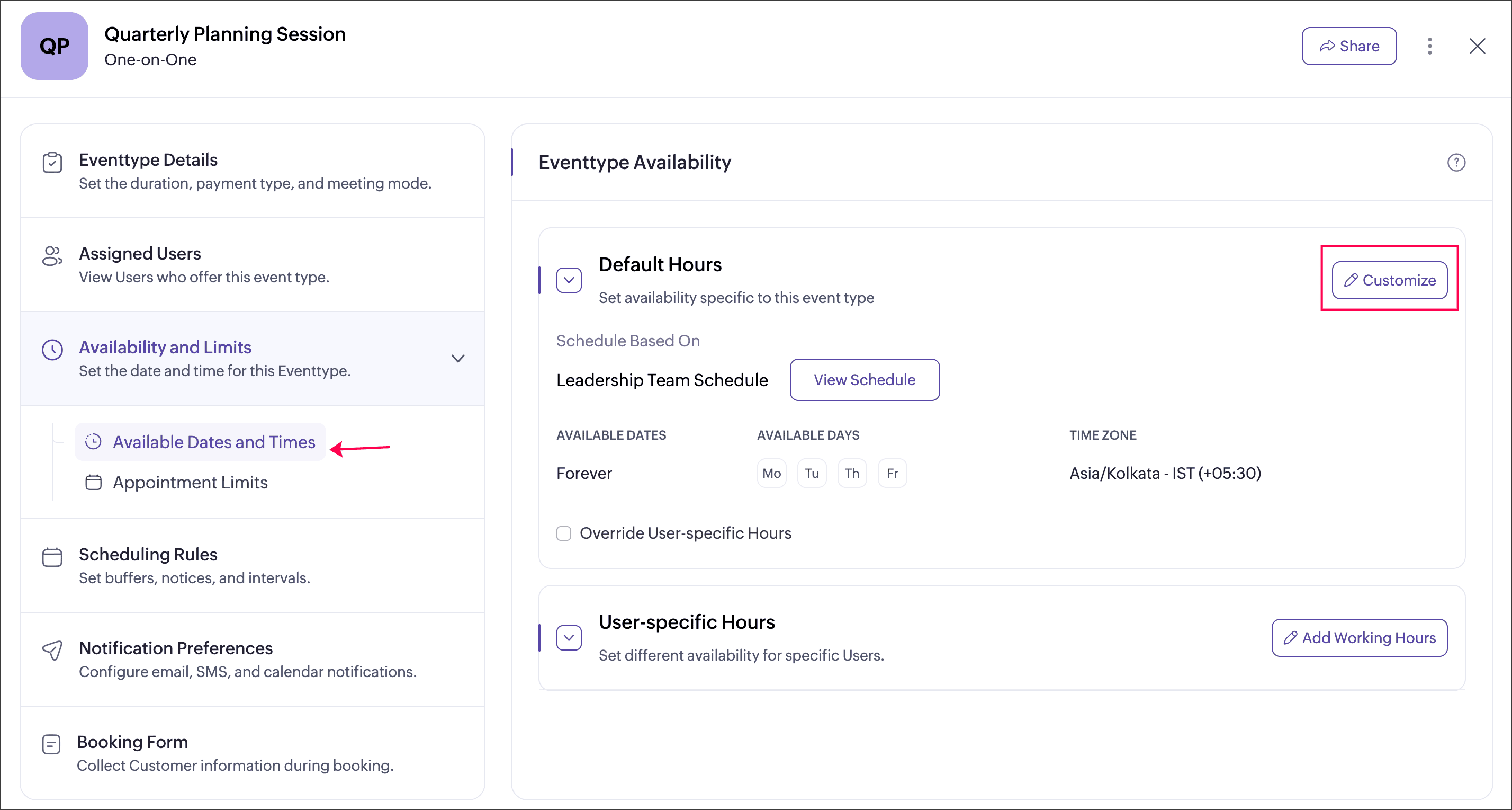 User-specific hours allow you to define a separate schedule for selected users within an event type. This helps when certain users need different availability from the default event type schedule. You can add multiple user-specific schedules for an event type, each applied to different users or groups of users. These schedules apply only to that event type and do not affect the users’ availability in other event types.