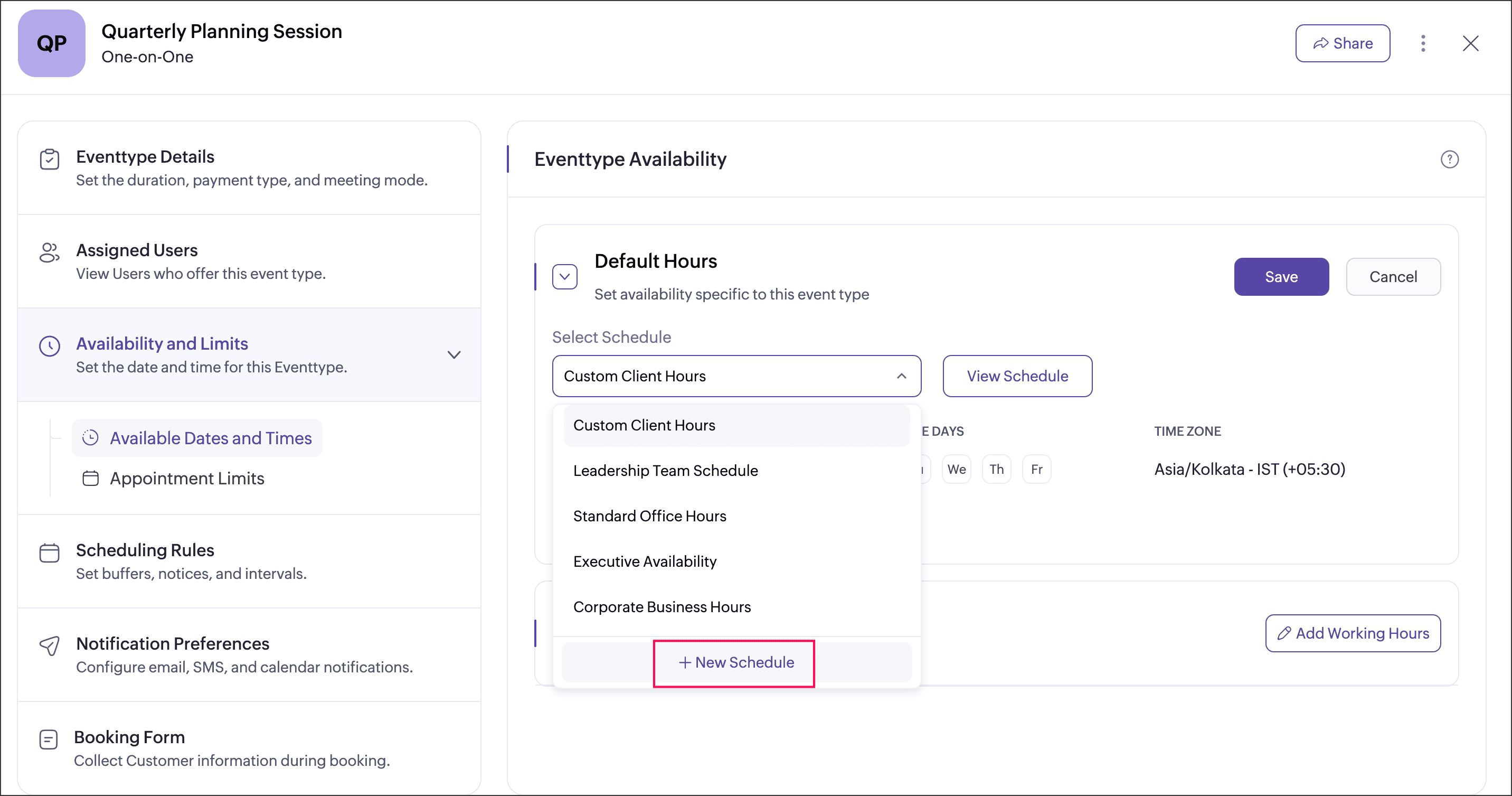 +New schedule: Create a new schedule with specific working hours and assign it to the event type.