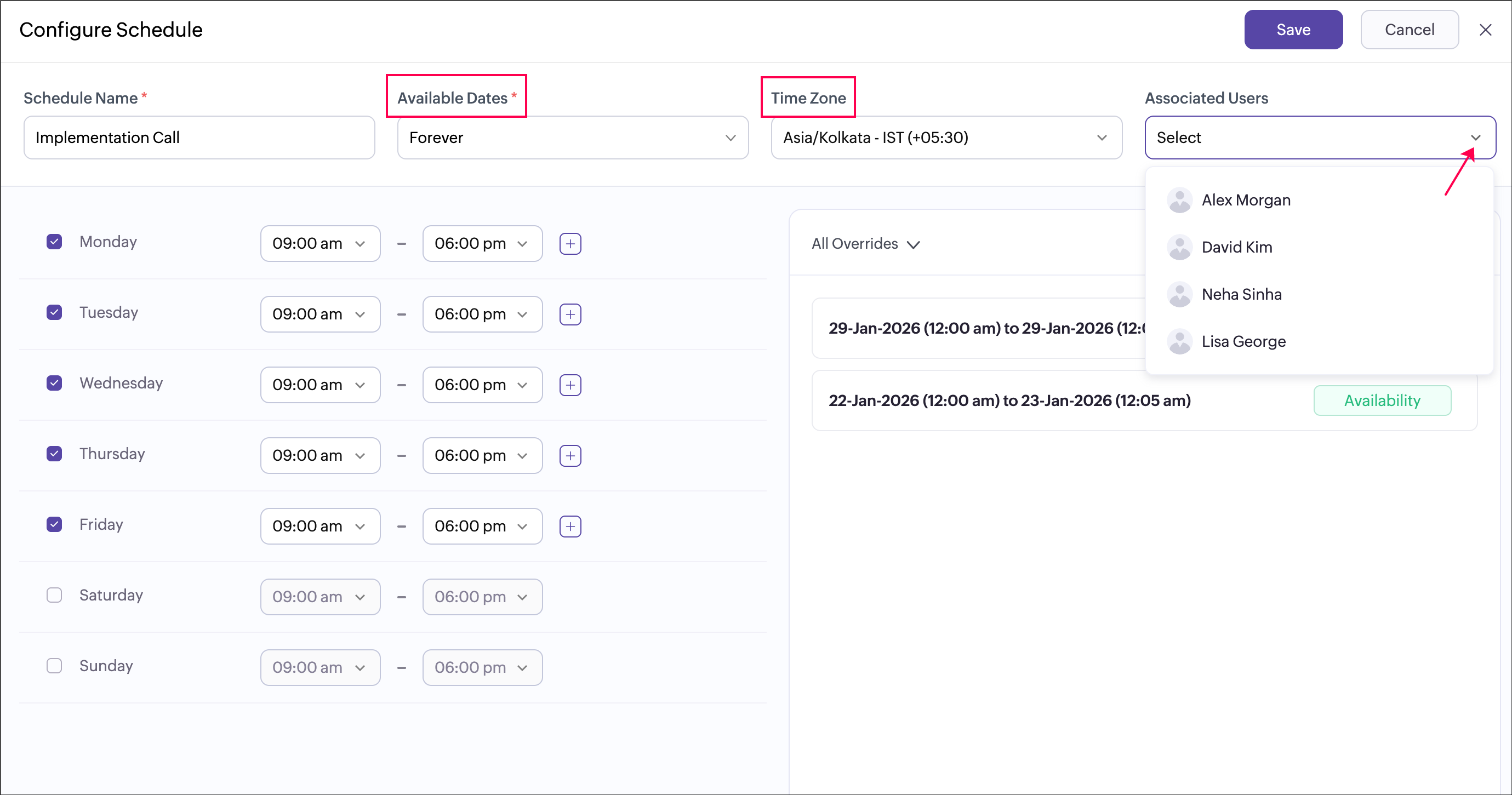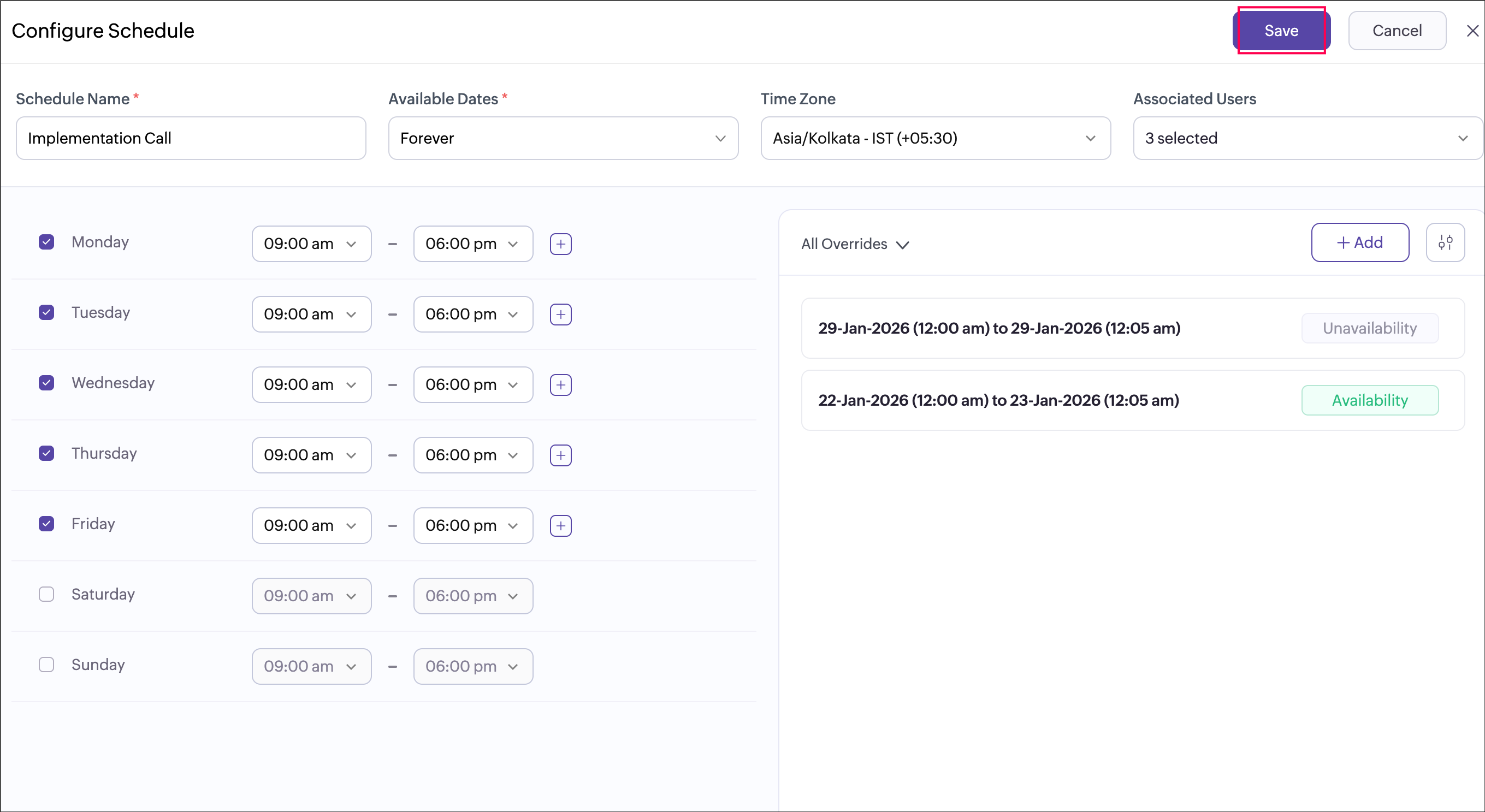 A sales team runs demo calls that are offered only during standard business hours Monday to Friday, 9 AM to 6 PM across multiple event types such as product demos, onboarding calls, and follow-up sessions. Instead of configuring availability for each event type separately, the admin creates a single “Sales Hours” schedule and assigns it to all related event types. Any update to the schedule, such as adding a holiday or changing working hours, is automatically reflected across all assigned event types, ensuring consistency and reducing manual effort.