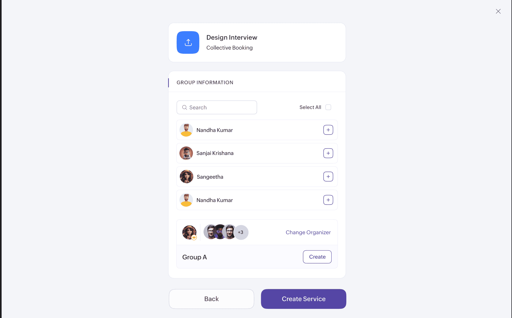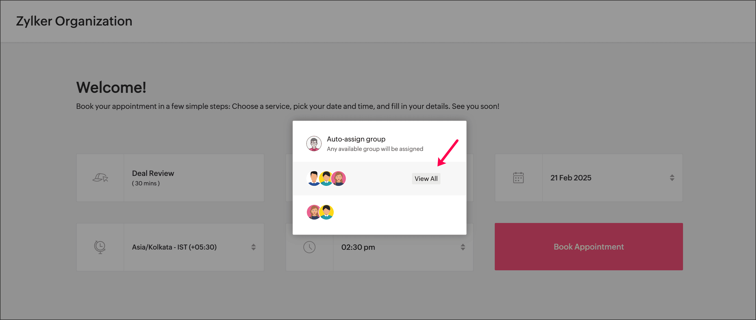 On the booking page, the customer can choose their preferred group and book the appointment. Also, they can view the users' names in each group by clicking View All adjacent to the group.