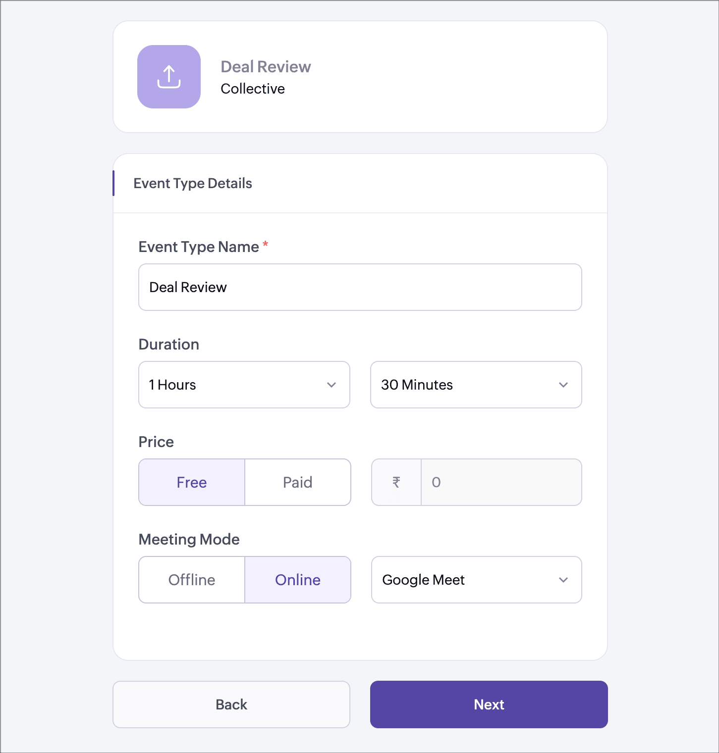 - If an online meeting is enabled for an event type, the organizer should integrate/add the meeting tool. Only then will a meeting link be created. The meeting link will be sent to all the users in the group through email.