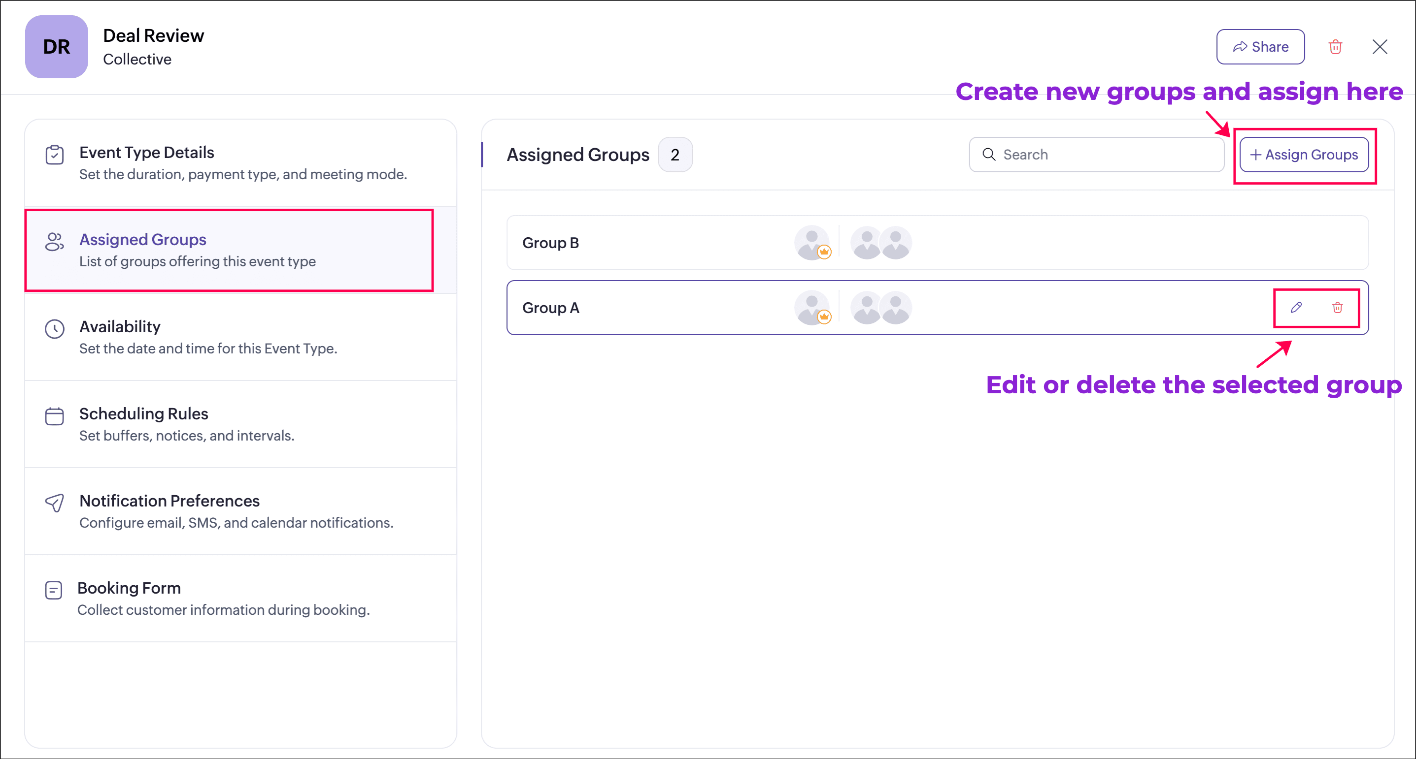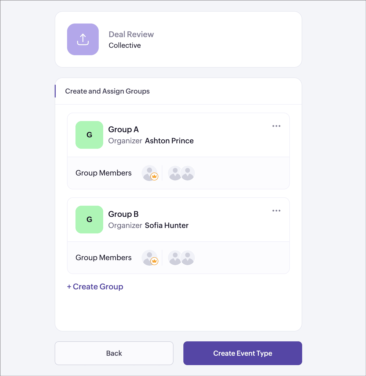- Create multiple groups and assign them to the event type.
