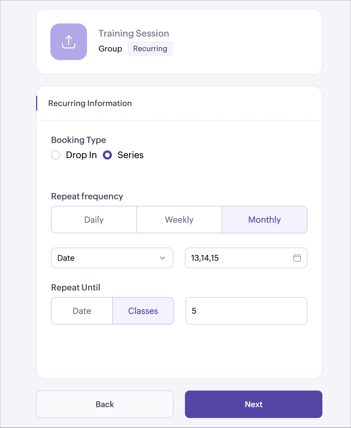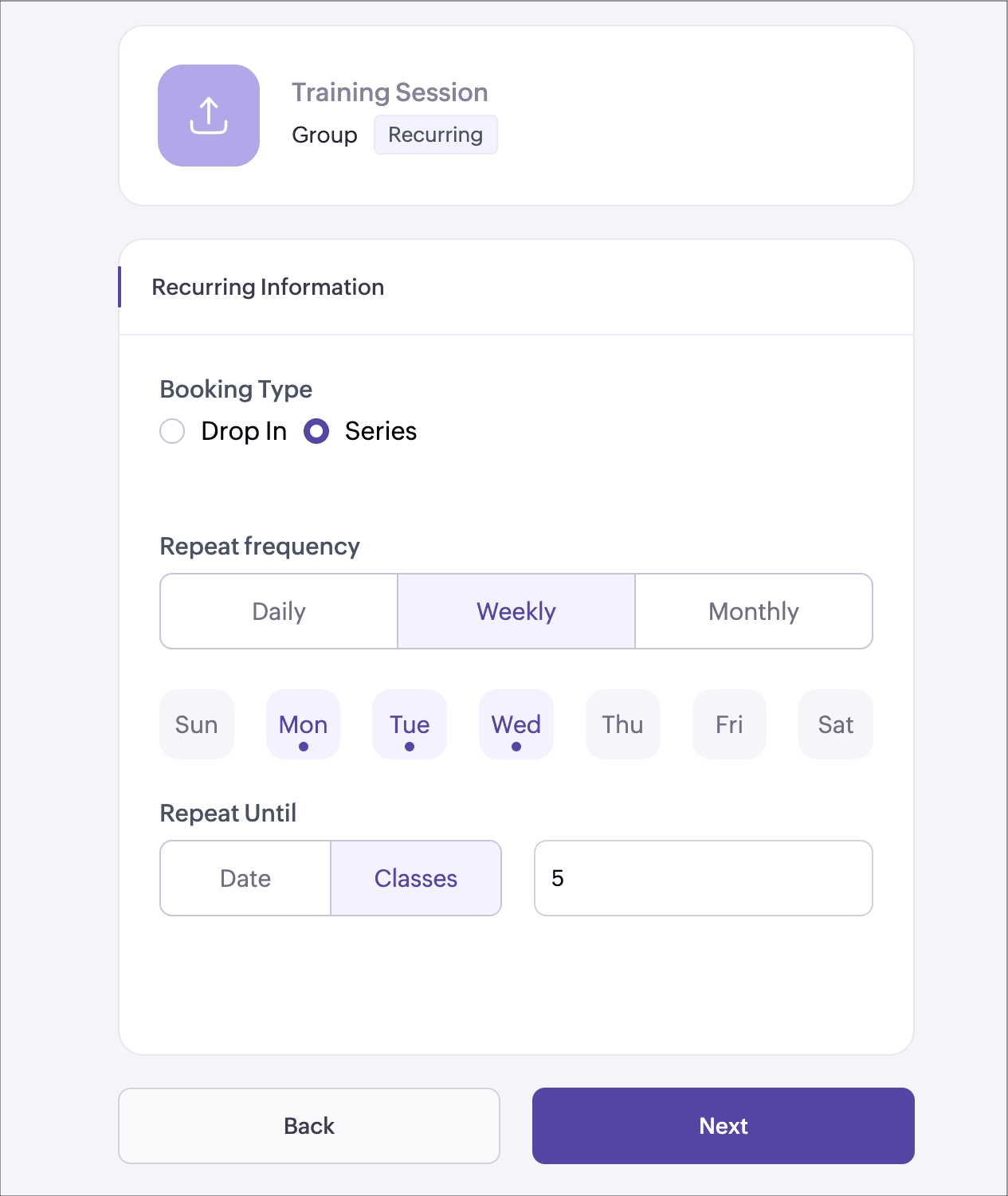 - Recurring series: A group session that repeats in a defined frequency, and sessions need to be booked as a whole. eg, a four week cooking class where participants book as a complete course.