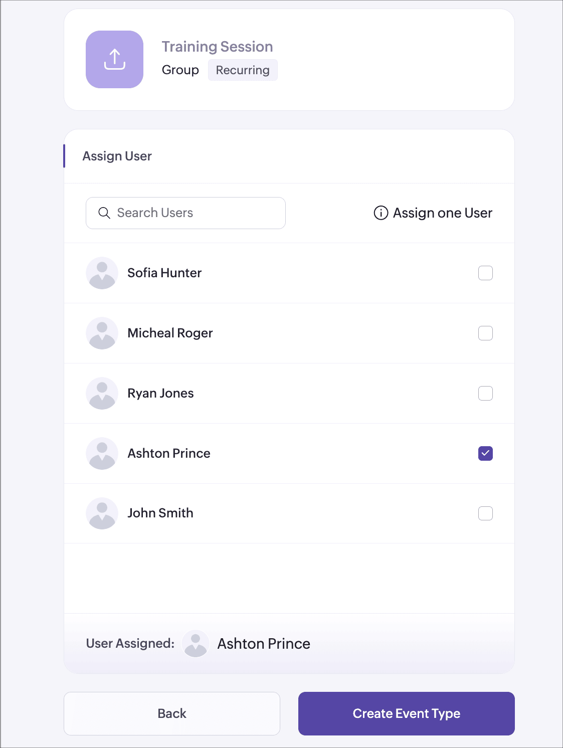 - Assign user: You can assign only one user to the group event type. Select any one user from the list of users.