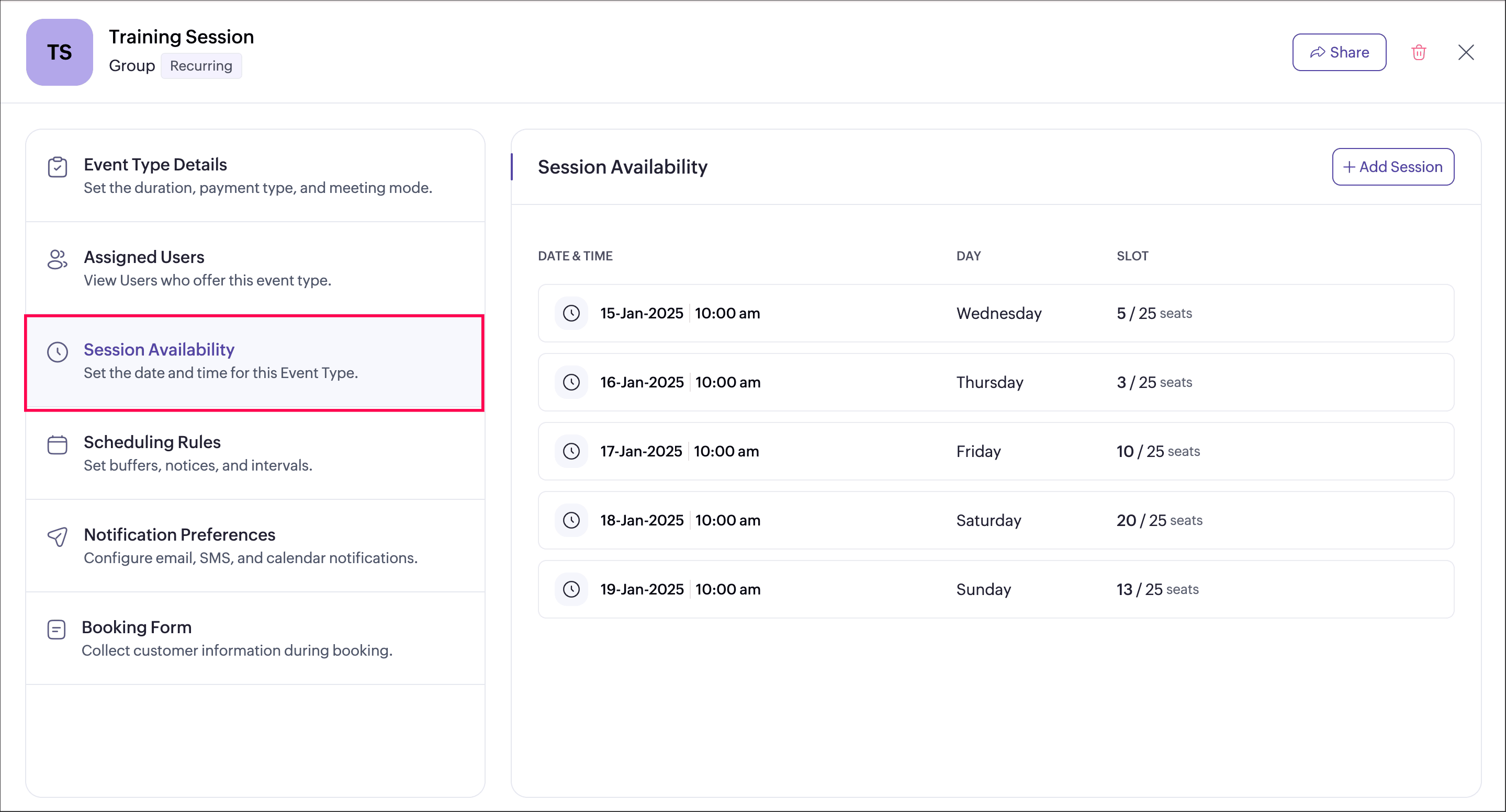 Navigate to the created group event type > Session Availability. This section displays the number of seats booked out of the total number of seats.