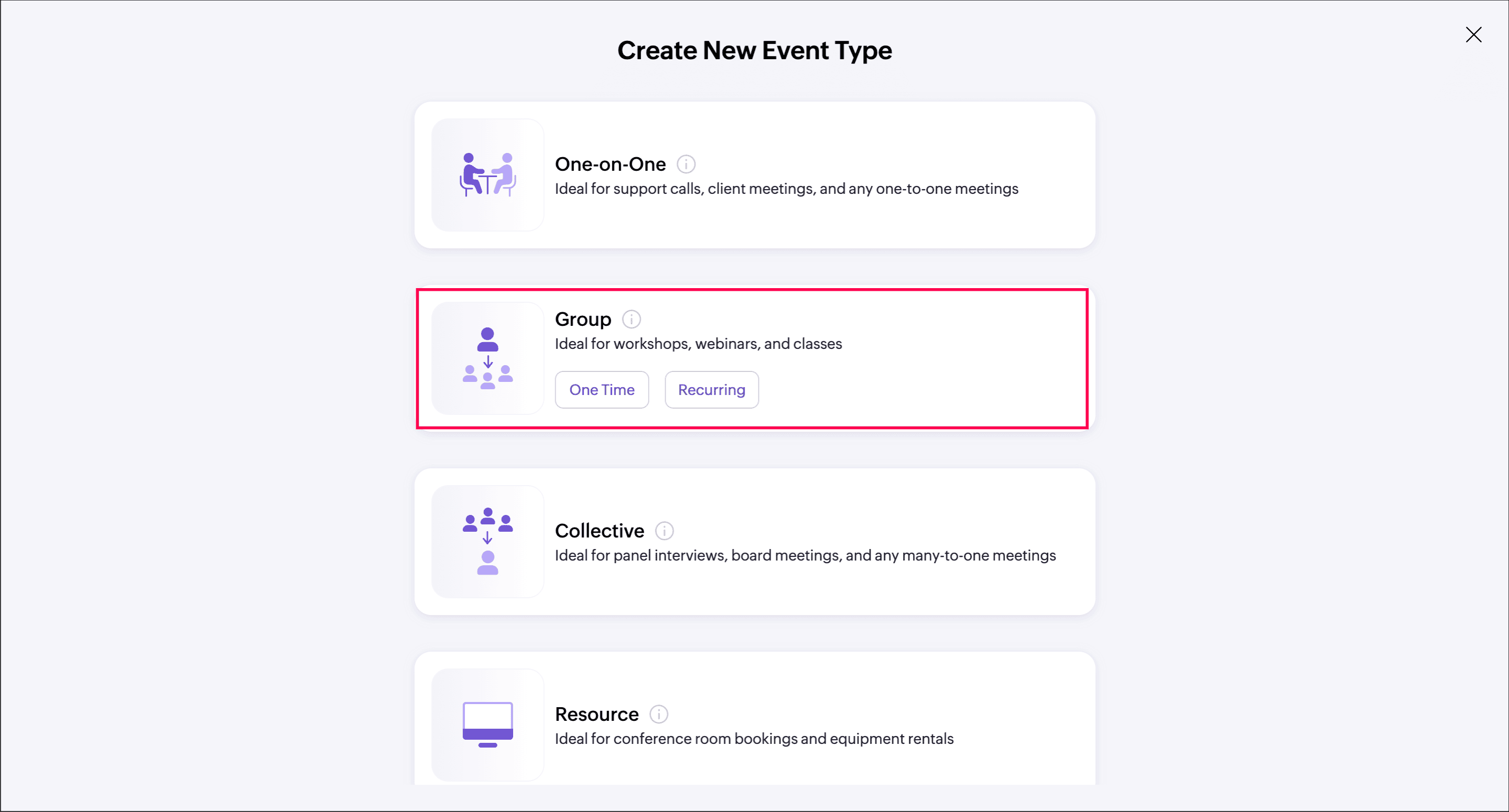 Group event type allows you to conduct sessions with one host and multiple participants. For example, webinars, training workshops, short-term courses.